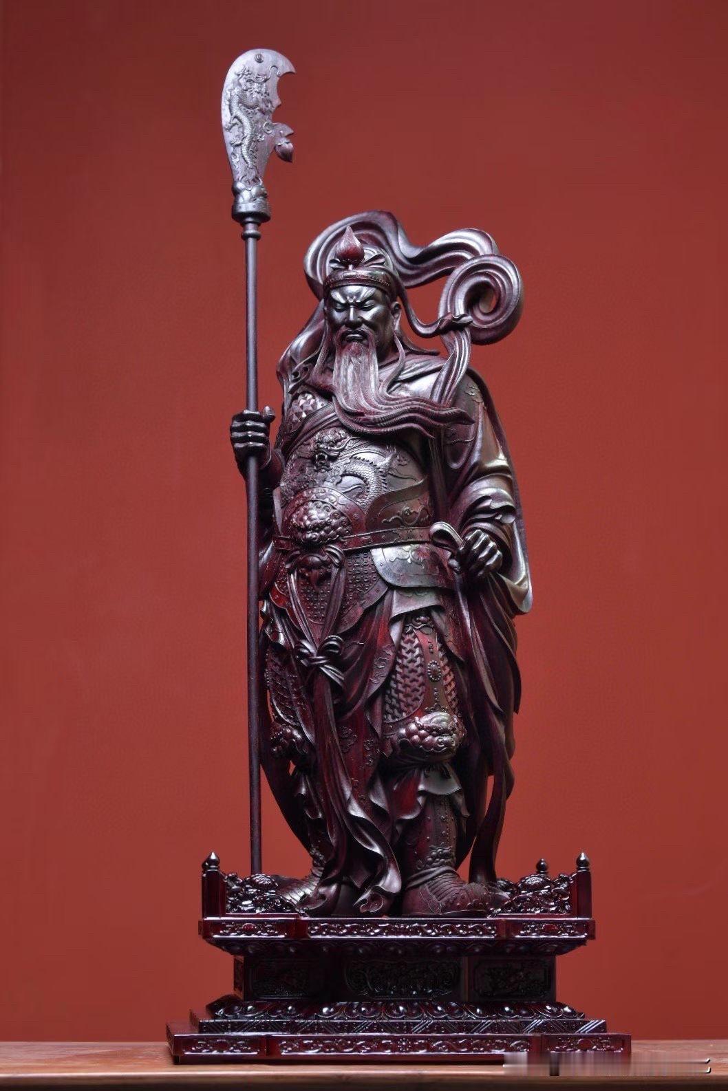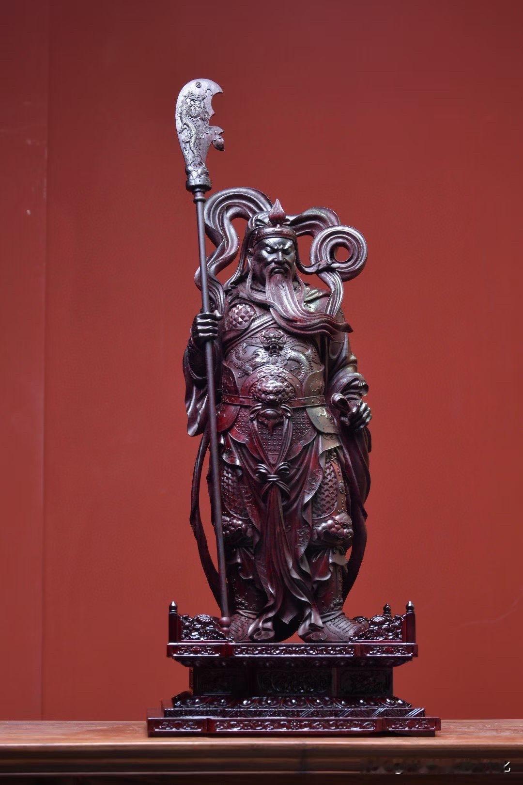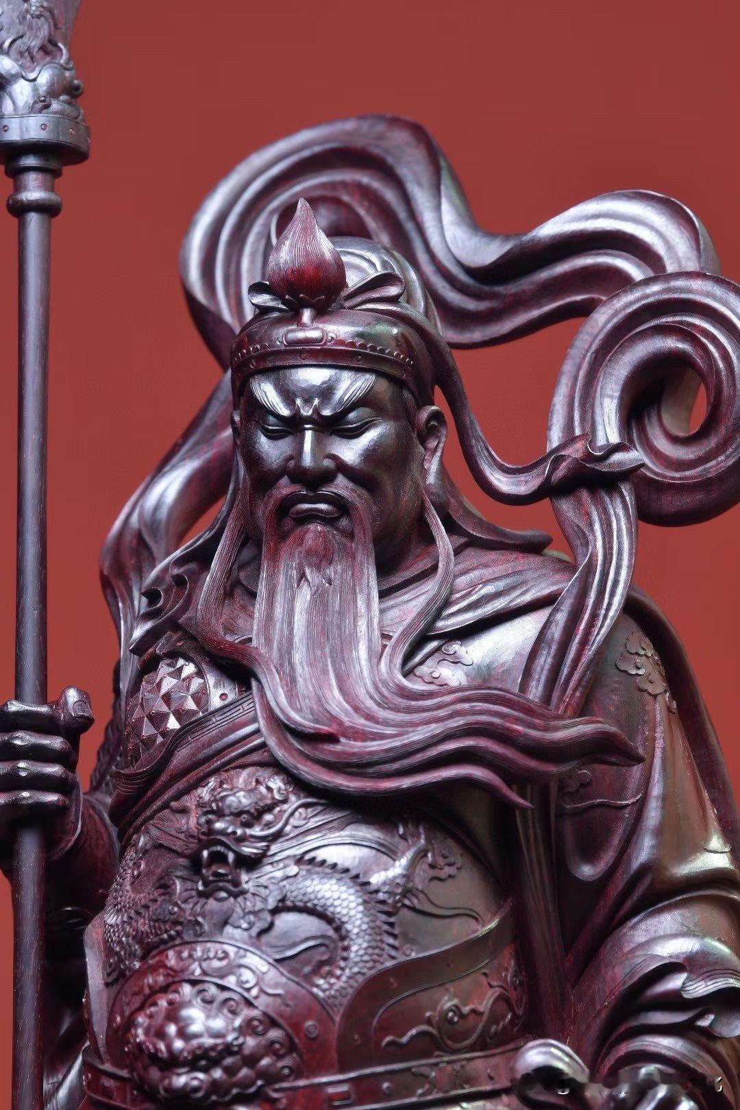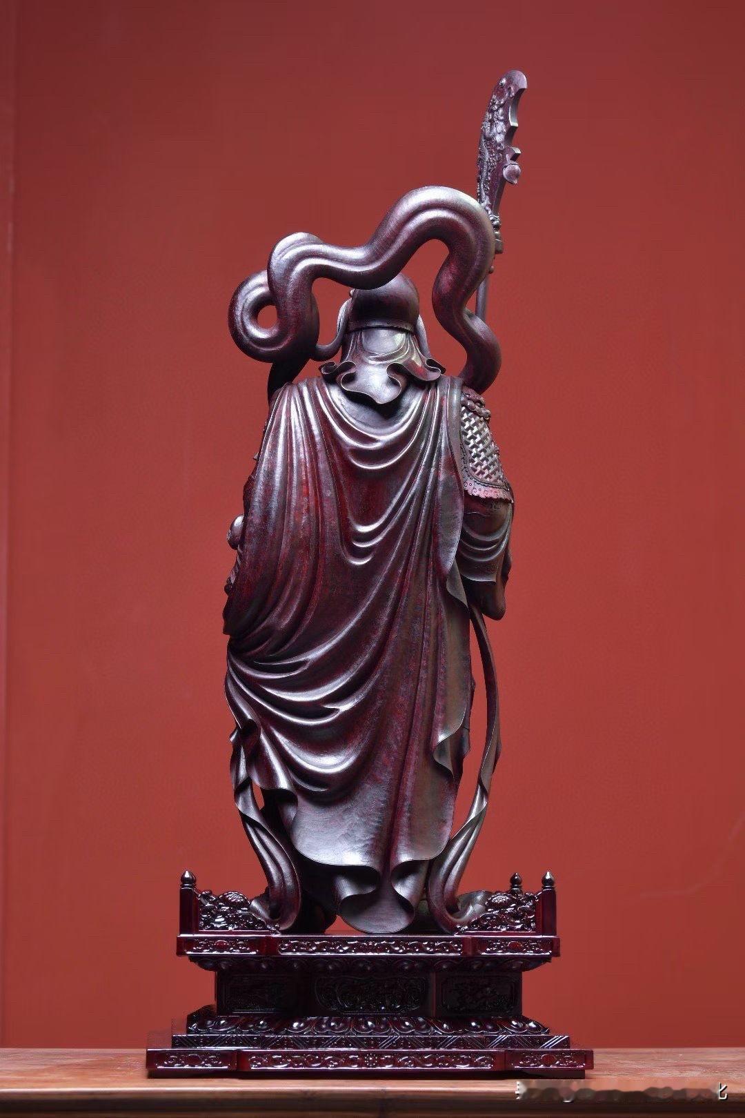 紫檀的沉润底色,把时间压进木性里,光不耀,却有分量。刀法不急,盔甲层层递进,衣纹收放之间,自有节奏,连长须的起伏,都带着一股“稳”。