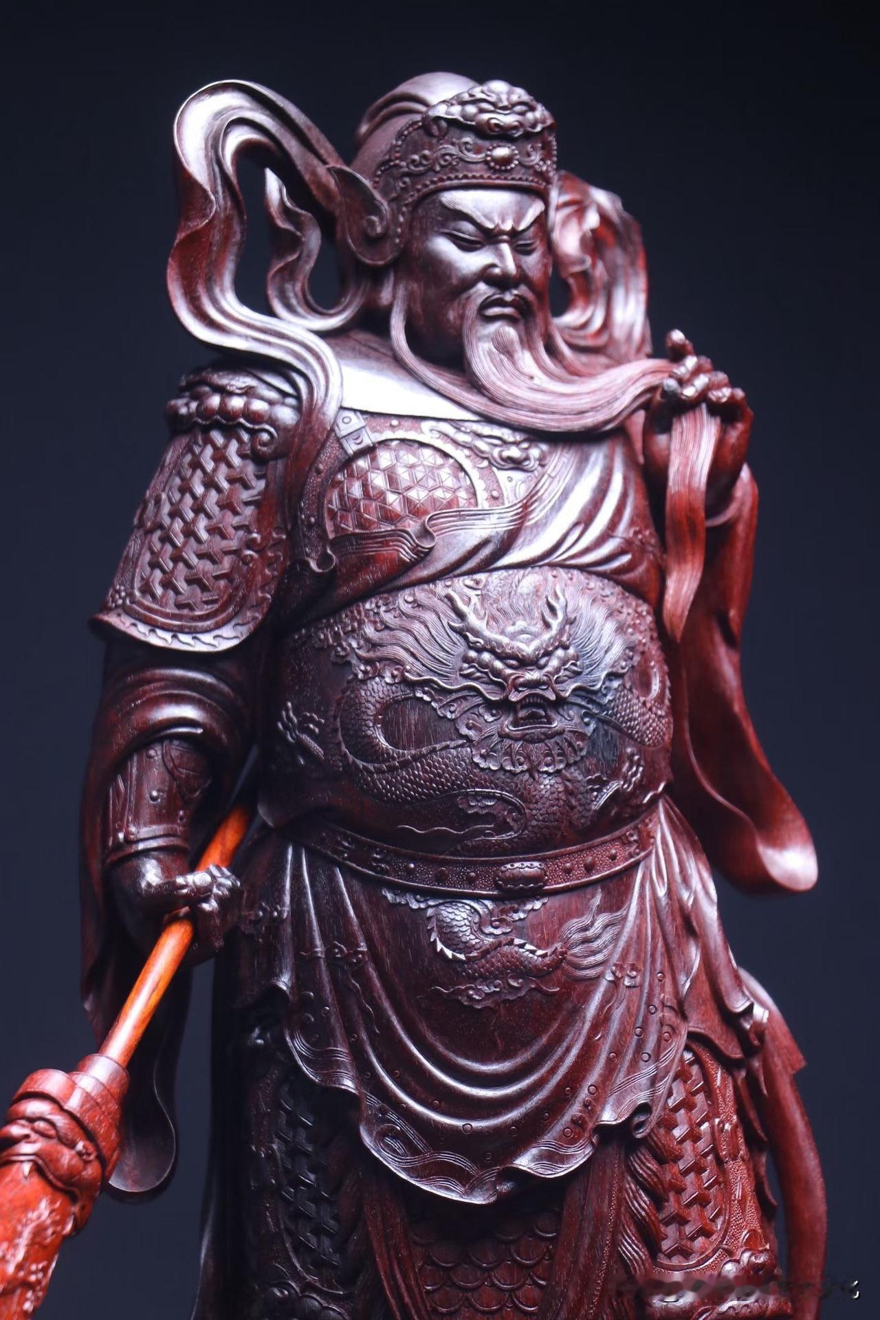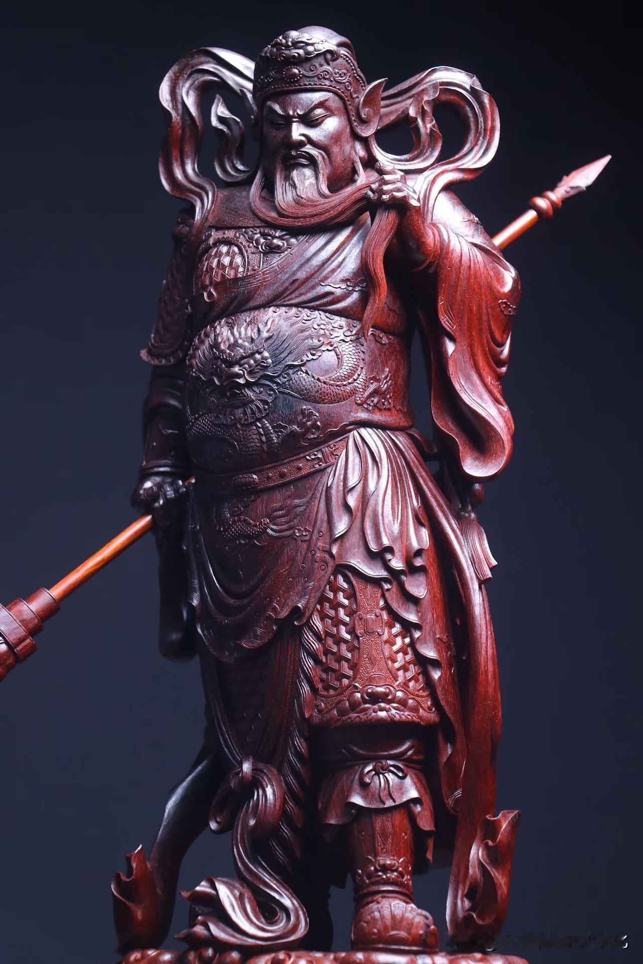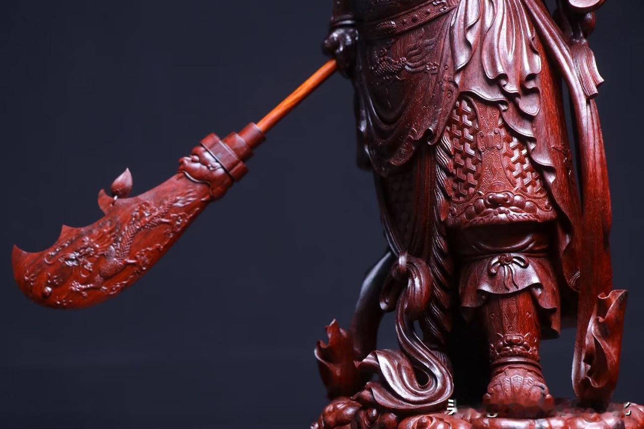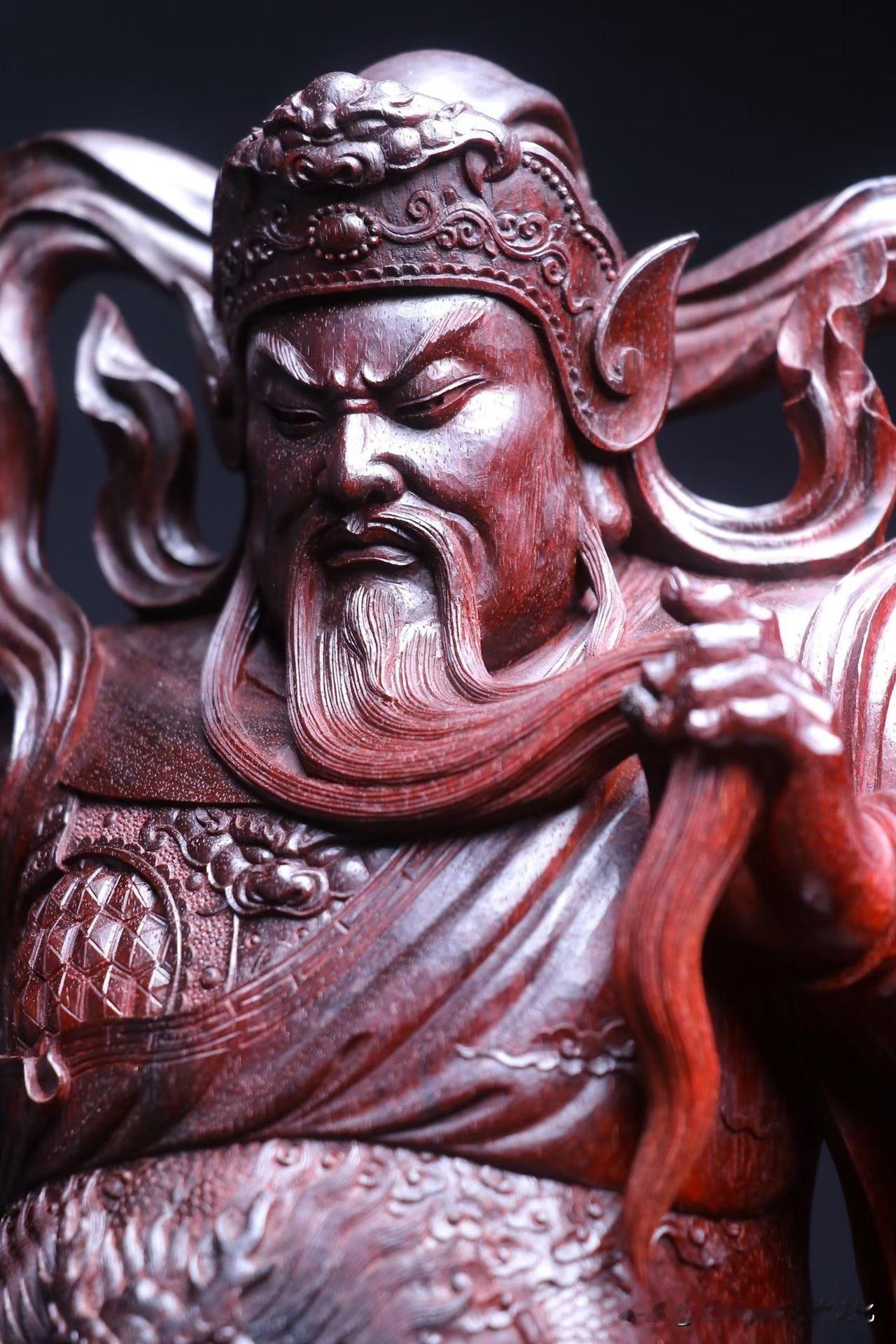小叶紫檀的沉稳底色,让整尊关公更显分量。铠甲层叠、龙纹暗涌,刀在手却不动,最有力量的反而是那一份收住的锋芒。