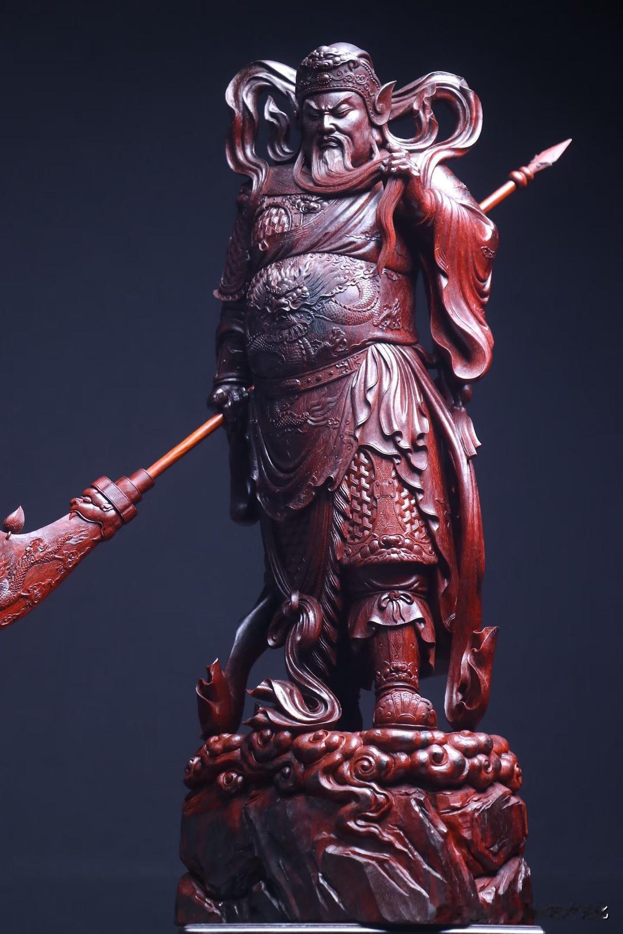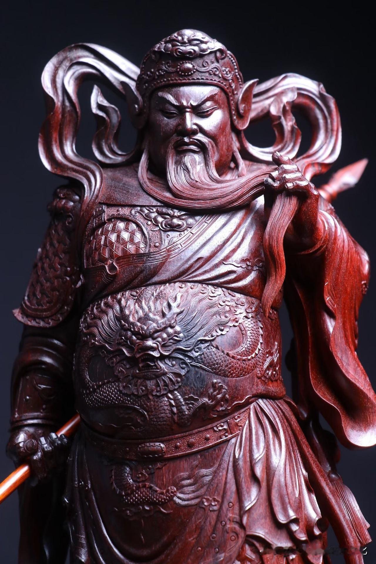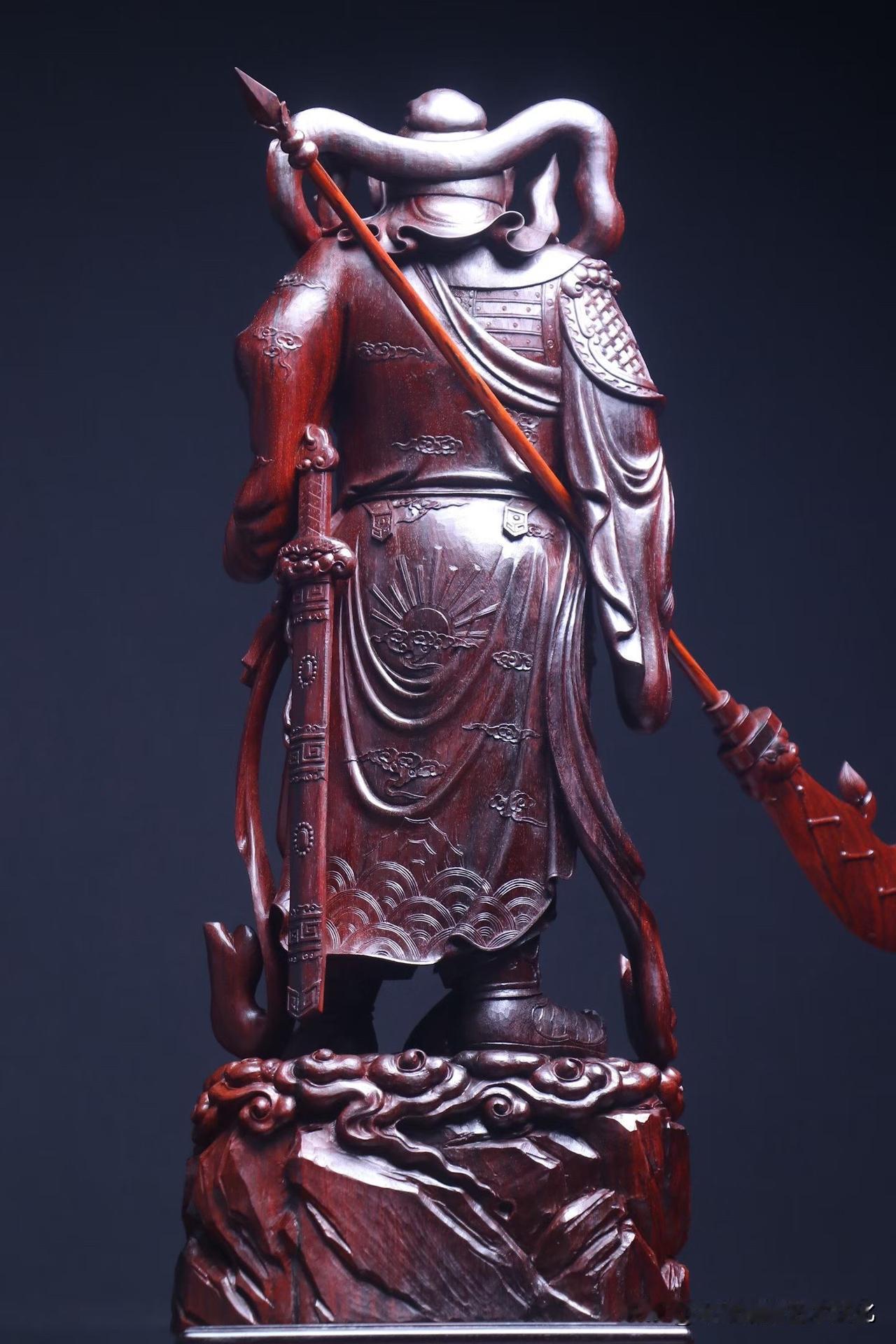 小叶紫檀的沉稳底色,让整尊关公更显分量。铠甲层叠、龙纹暗涌,刀在手却不动,最有力量的反而是那一份收住的锋芒。