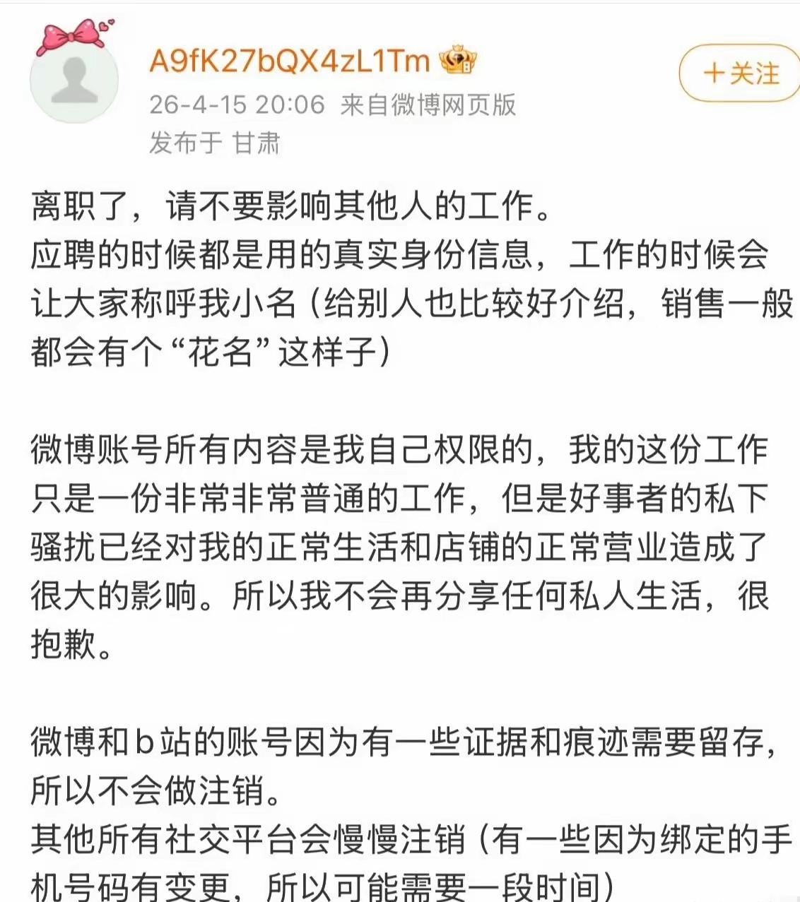 杨某媛还是太高调了,像打不死的小强。现在离职了。网络上的账号注销了。以后也不能嘚瑟了。她简直是分享欲爆棚,刚找了一份工作,就开始发工作照,在兰州万达茂某店当销售。现在品牌店口碑崩盘了,门店跟着遭殃。本来网络像一阵风,过去了就过去了。可她非要出来蹦跶一下。引起大家的厌恶之心。