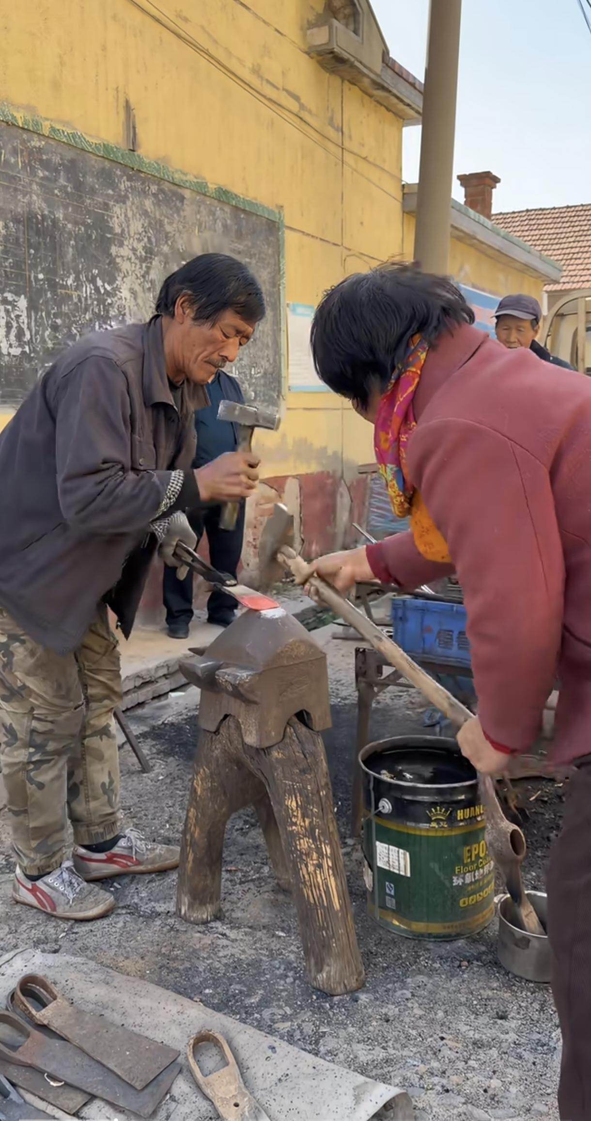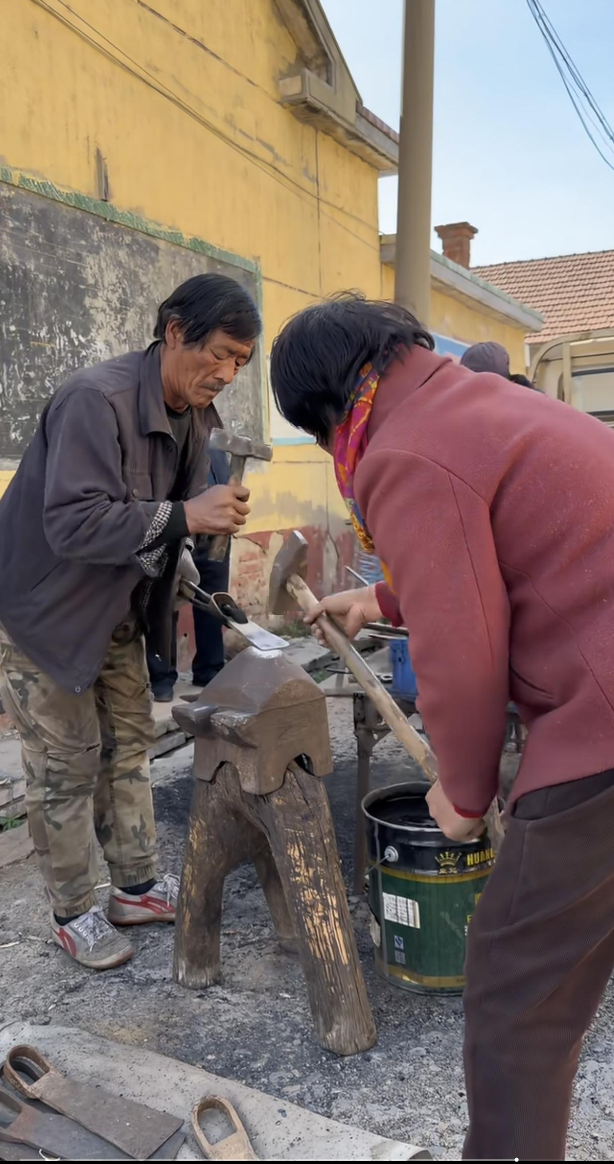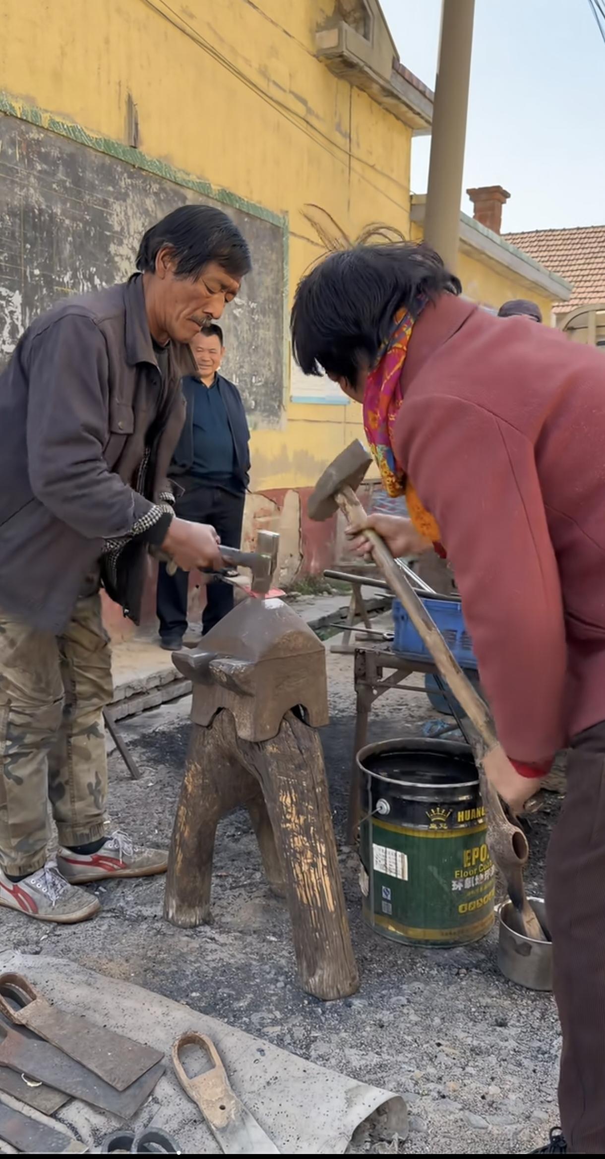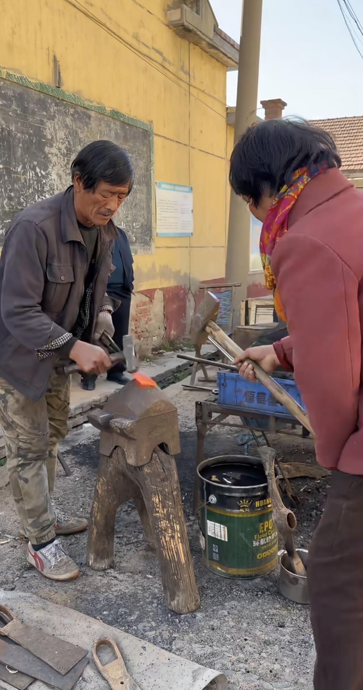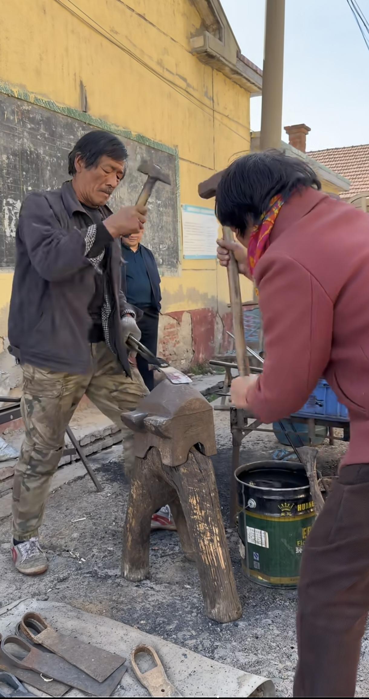 打铁老夫老妻火了,视频已经火到国外了。哇,好有节奏的律动,妻子明显很厉害,打了6