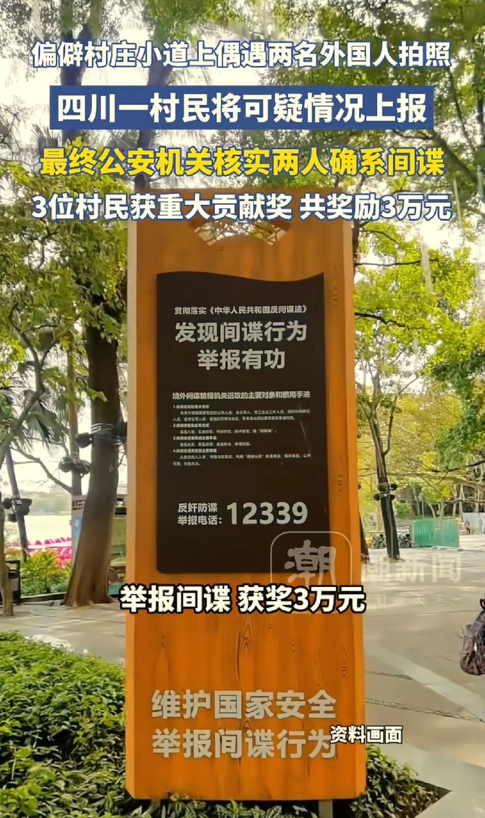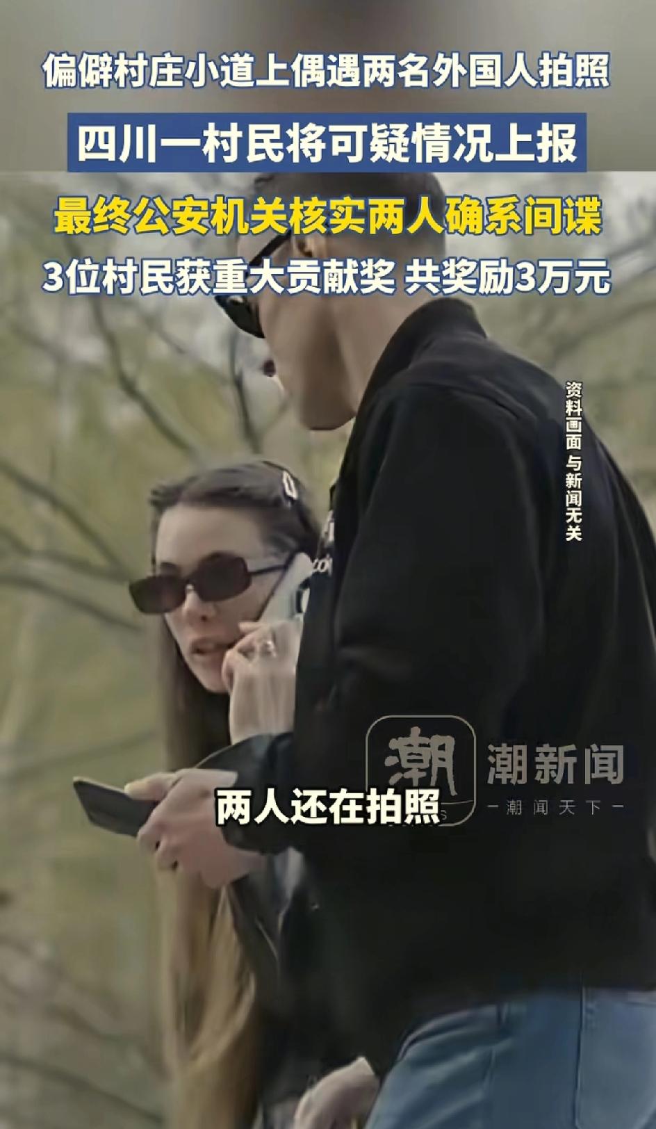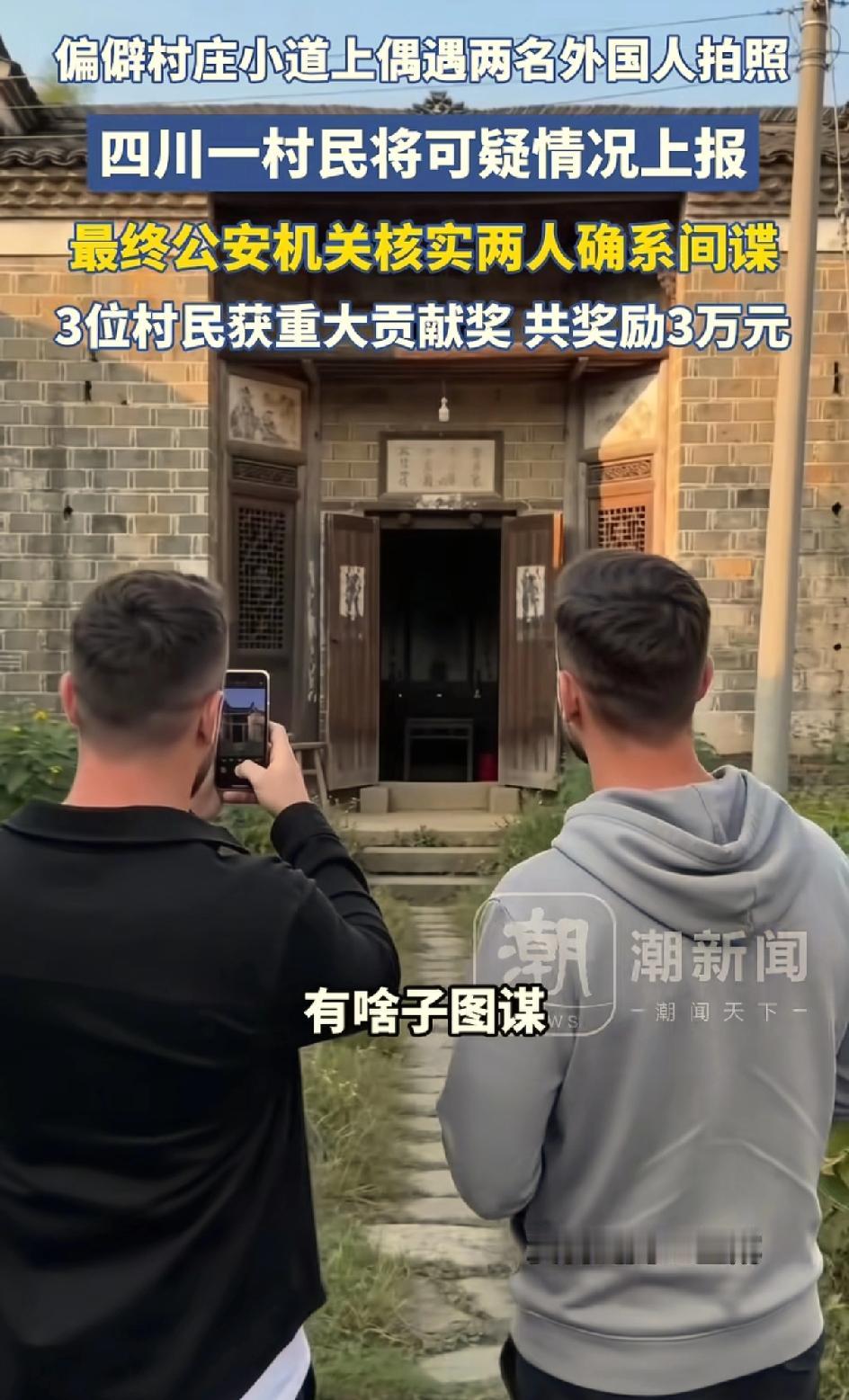 四川雅安三个村民抓到两个外国间谍,获奖3万。在他们村偏僻的村庄小道上,有两个外国人,在这里拍照拍了两个小时,他们村里面在建一个重大的工程。我觉得很可疑,外国人到中国来旅游,肯定会到名胜古迹去,怎么会跑到村庄里面?而且跟他们说话的时候,他们假装听不懂中国话,用翻译软件说他们在拍风景。后查出身份确实是间谍。