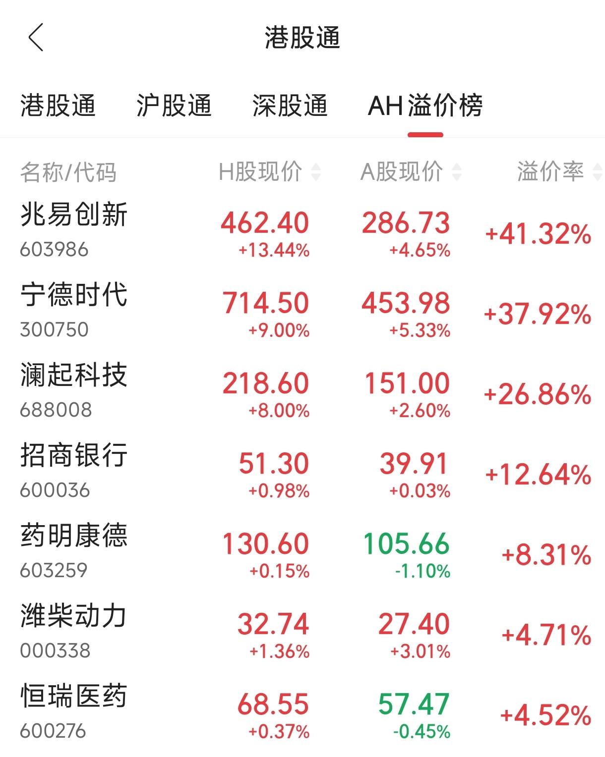 宁德时代H股对A股溢价37.9%,兆易创新H股对A股溢价41.3%,澜起科技H股对A股溢价28.9%,招商银行H股对A股溢价12.6%,药明康德H股对A股溢价8.3%。
