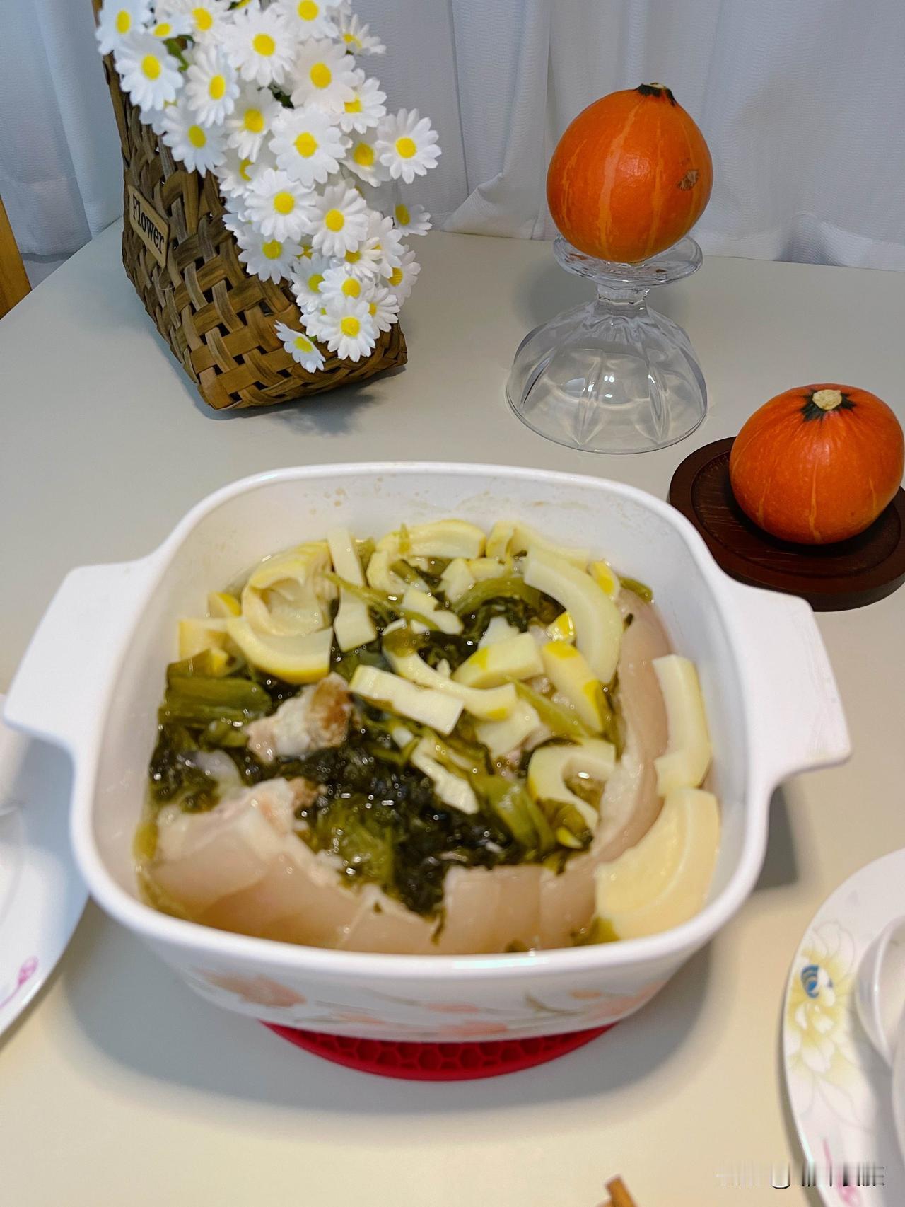 苦笋咸菜五花肉,我妹妹送的苦笋,还教了我做法。这道菜需要时间沉淀才够入味,五花肉和苦笋先炖熟,再放咸菜和咸菜汁,煮开后熄火,让肉在汤里浸泡五小时以上。