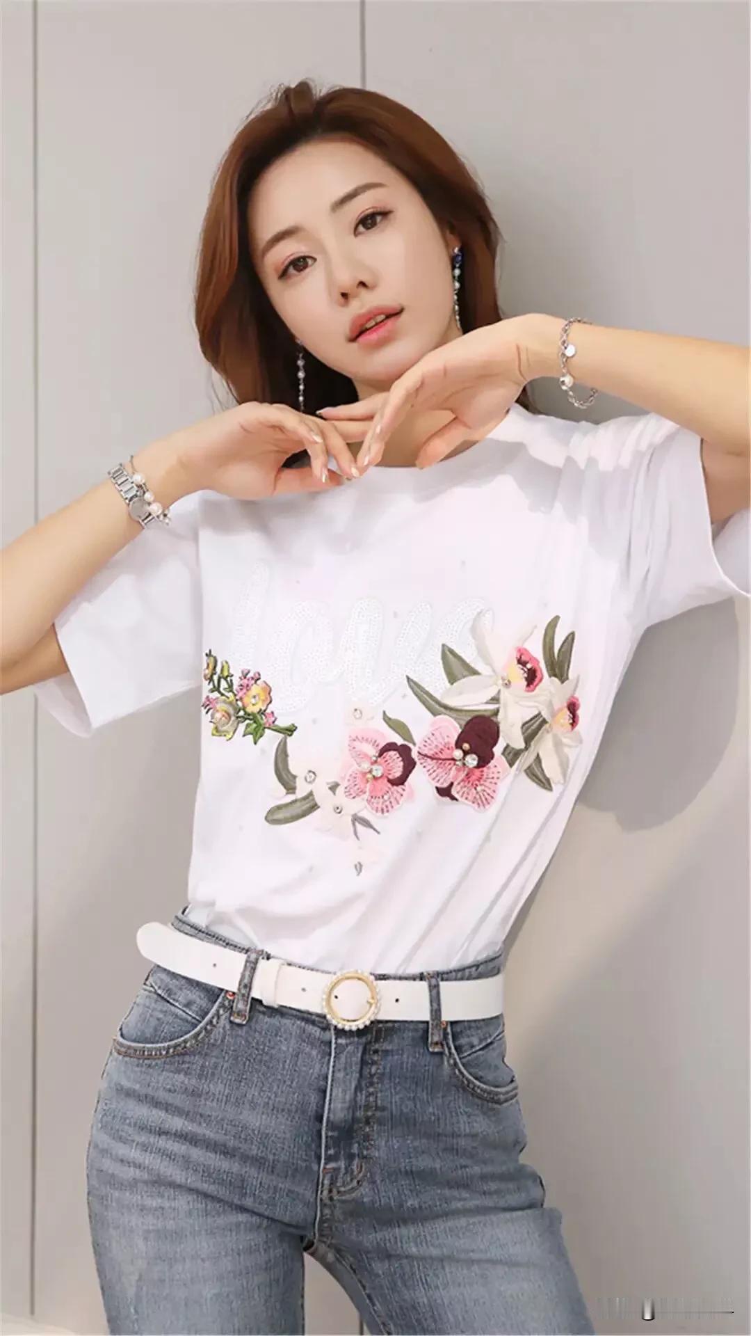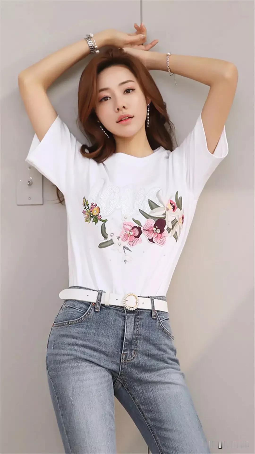 白色T恤+牛仔裤,这对组合真是清新少女风穿搭的经典。就像有的青春小姐姐这么穿,活
