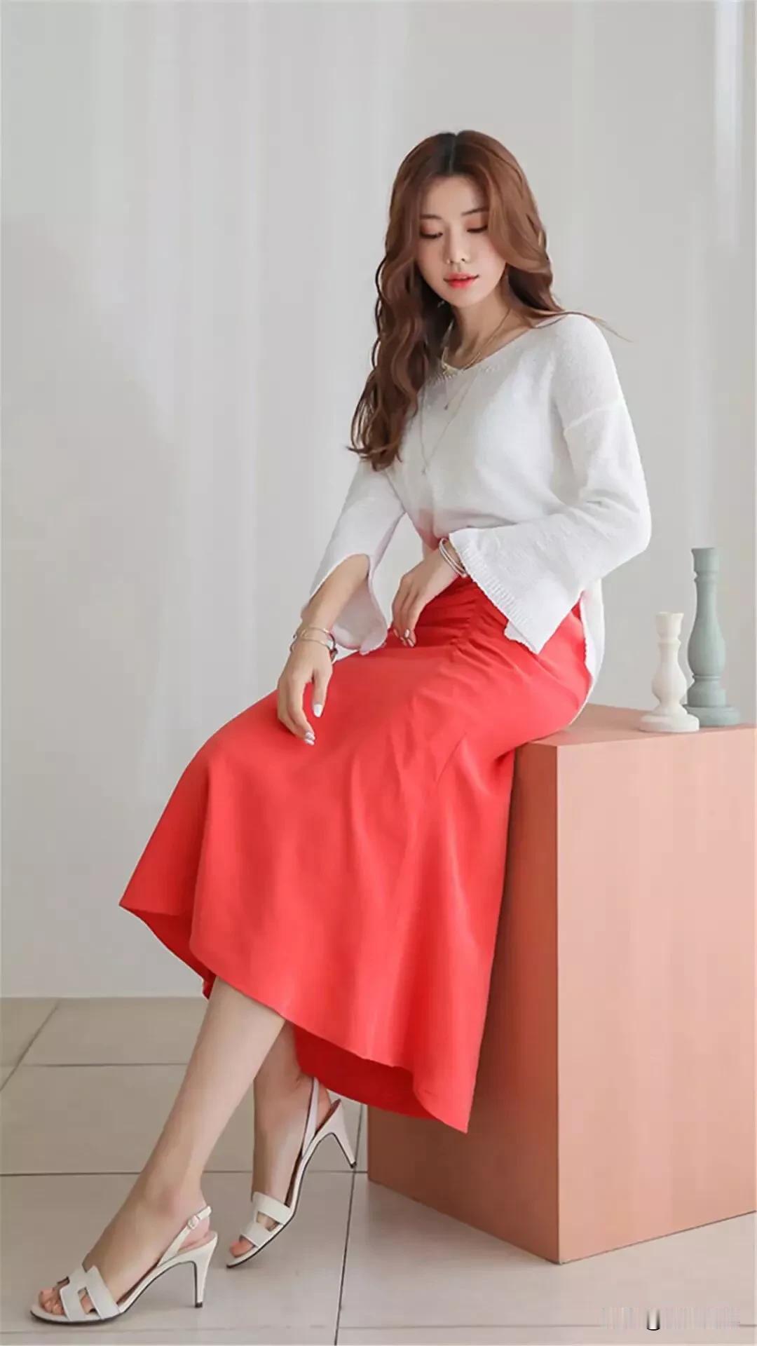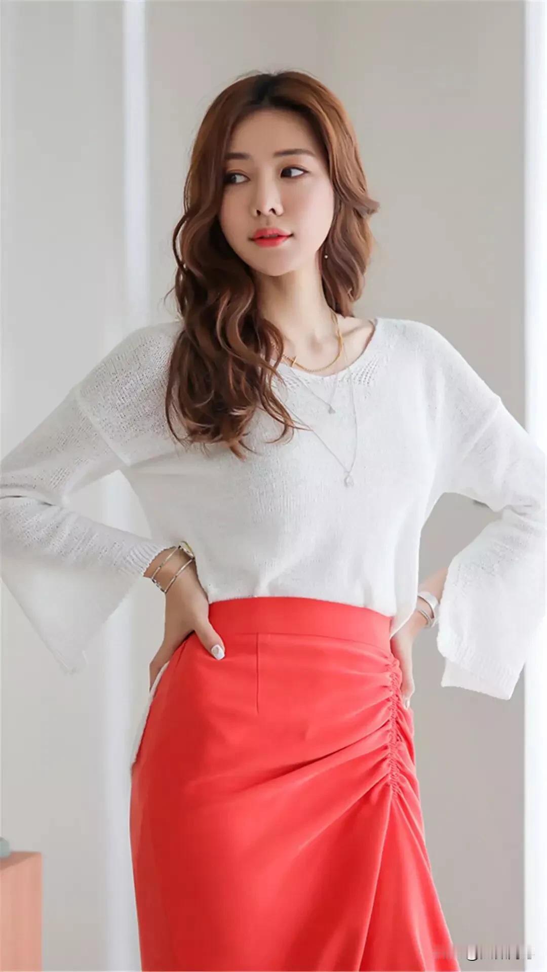 温柔白毛衣搭配亮眼红裙子,简直是气质女神的标配!就像毛晓彤的米白色针织T恤配红色