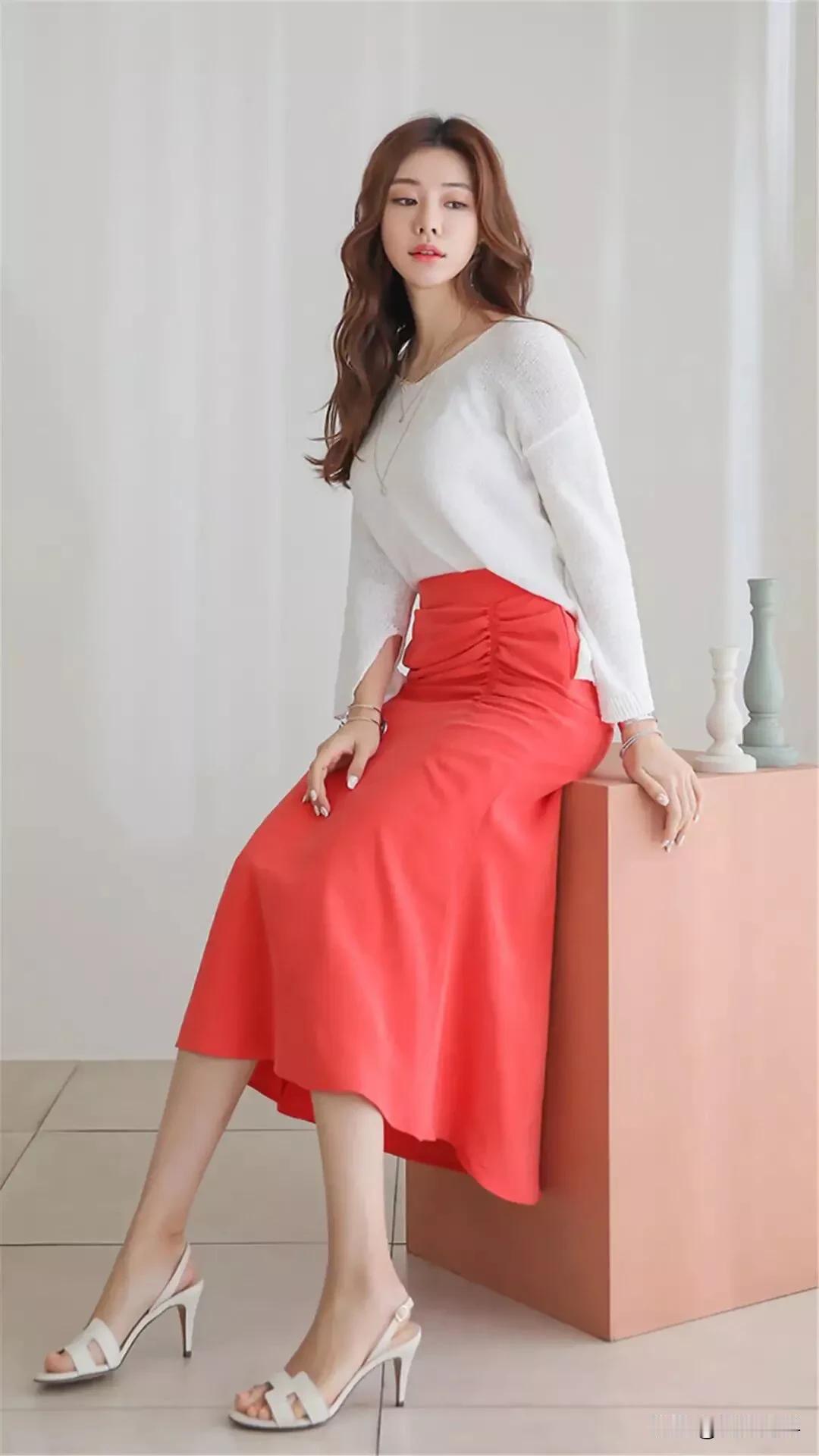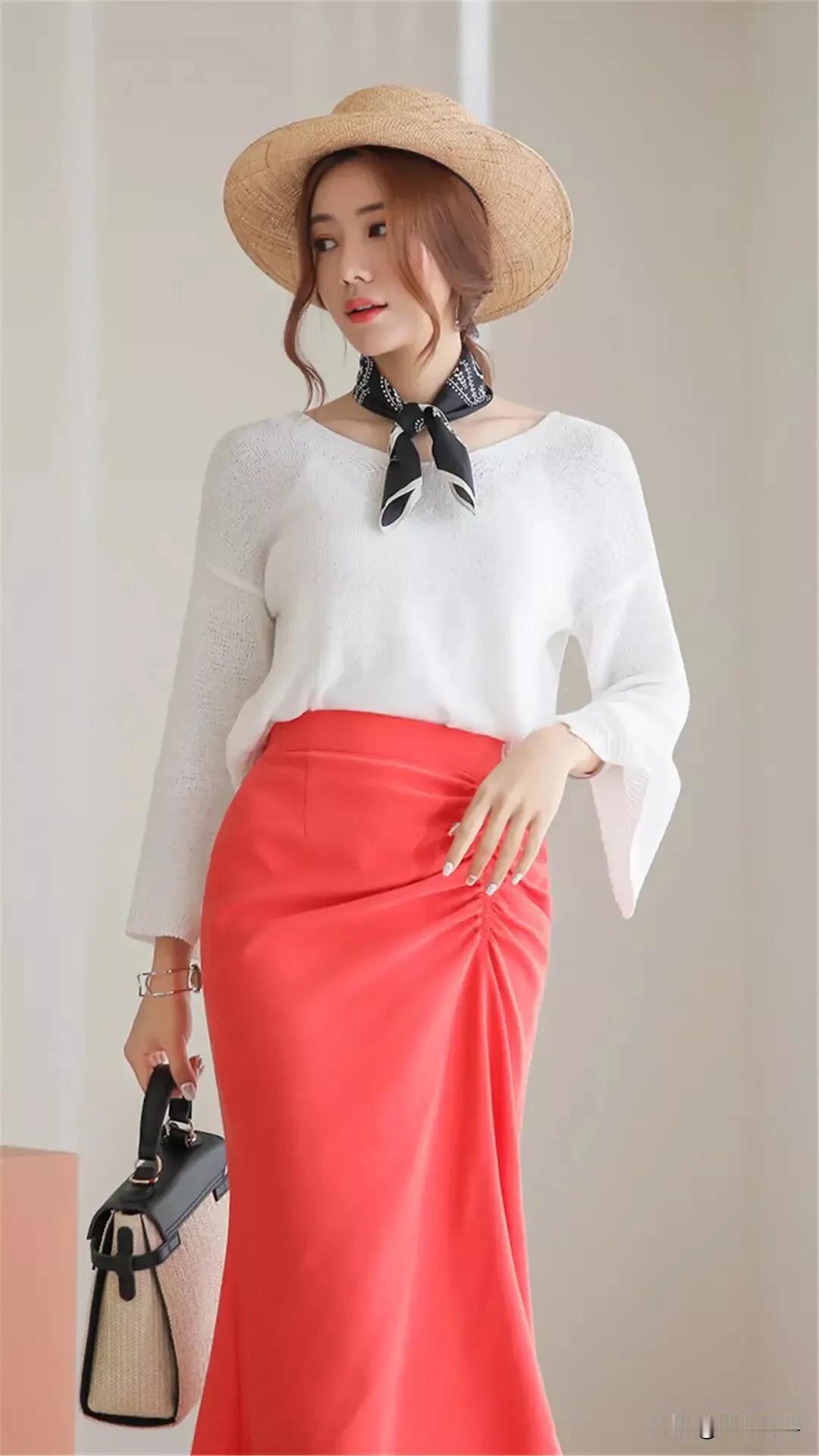 温柔白毛衣搭配亮眼红裙子,简直是气质女神的标配!就像毛晓彤的米白色针织T恤配红色半身裙,又美又甜超养眼。