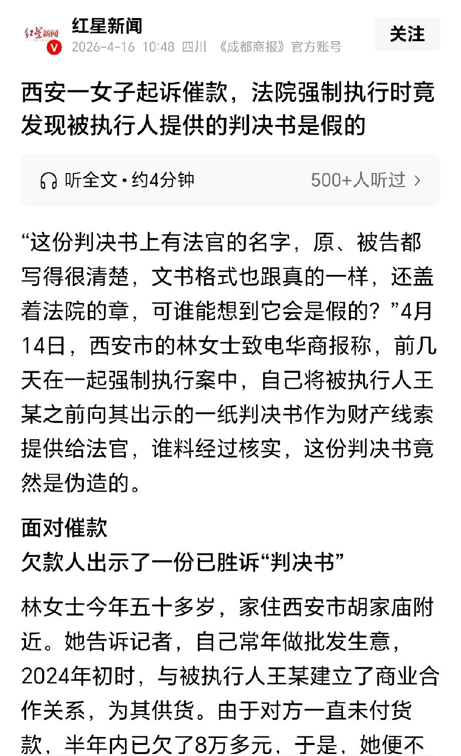 造假造到法院头上了?陕西西安,男子拖欠女子8万多元货款迟迟不还,女子多次讨要无果,只能把他告上法庭。胜诉后,男子依旧不执行法院判决,只给女子发来一份法院判决,是第三方拖欠男子的判决。女子为了尽快拿到欠款,申请执行第三方的财产,万万没想到,这份看起来很真实的判决书,竟然是伪造的。女子:文书格式和真的一样,上面还有法院的章,谁能想到这也能造假?