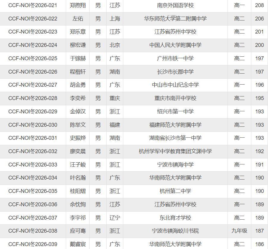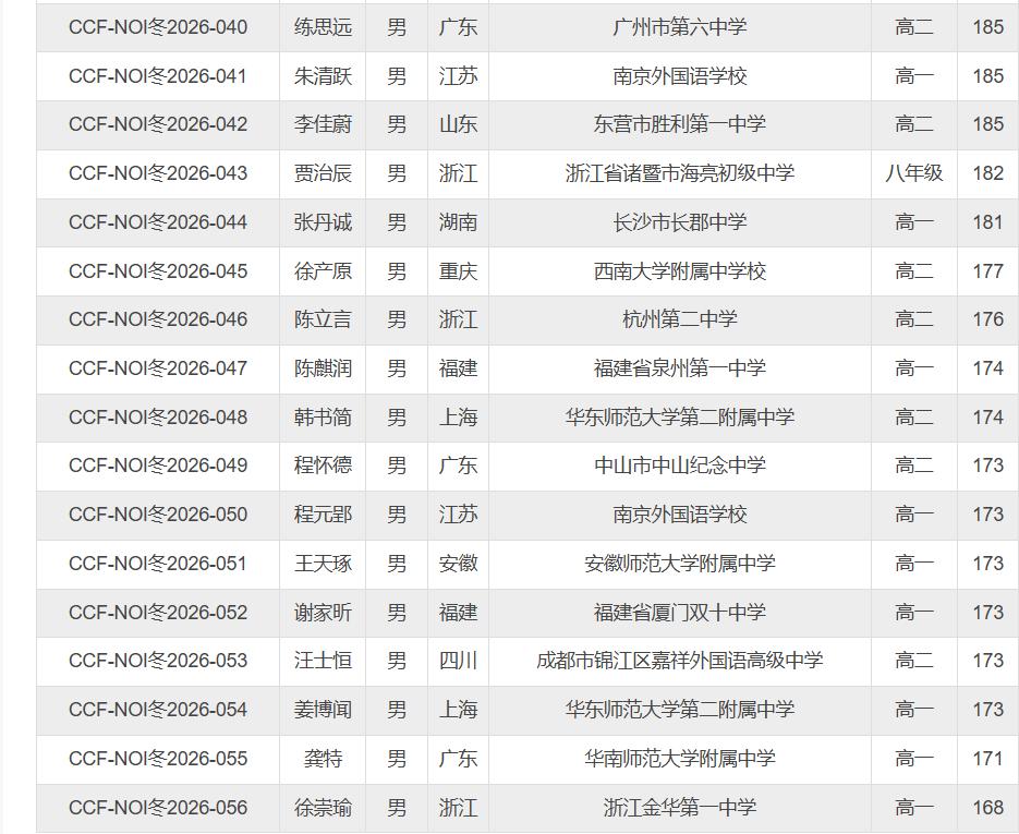 2026全国信息学奥林匹克冬令营(NOI)金牌获奖名单2月12日正式出炉,来自全国各地中学的共56同学获奖。其中包括来自重庆南开中学的李奕希同学、重庆西南大学附属中学的徐产原同学,成都外国语学校的蒋明睿同学、成都锦江嘉祥外国语高级中学的汪士恒同学,具体如下表: