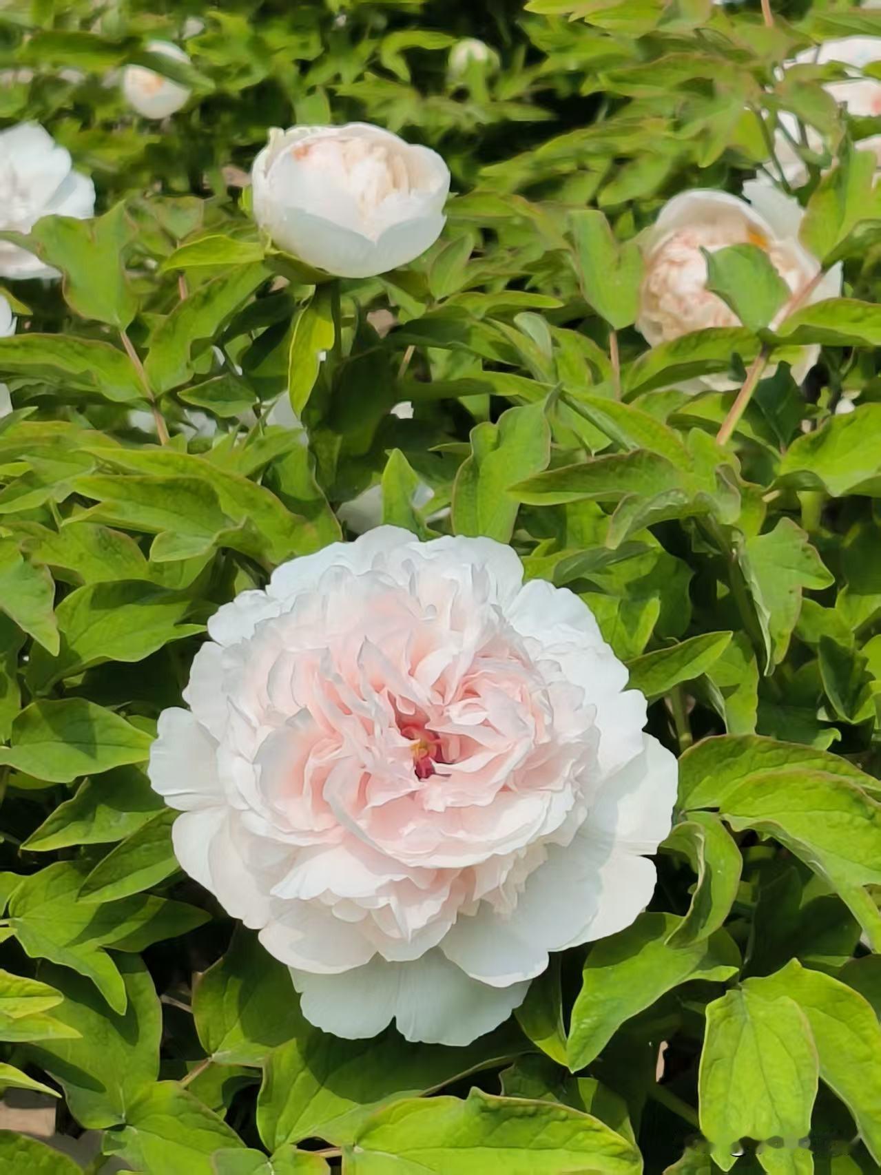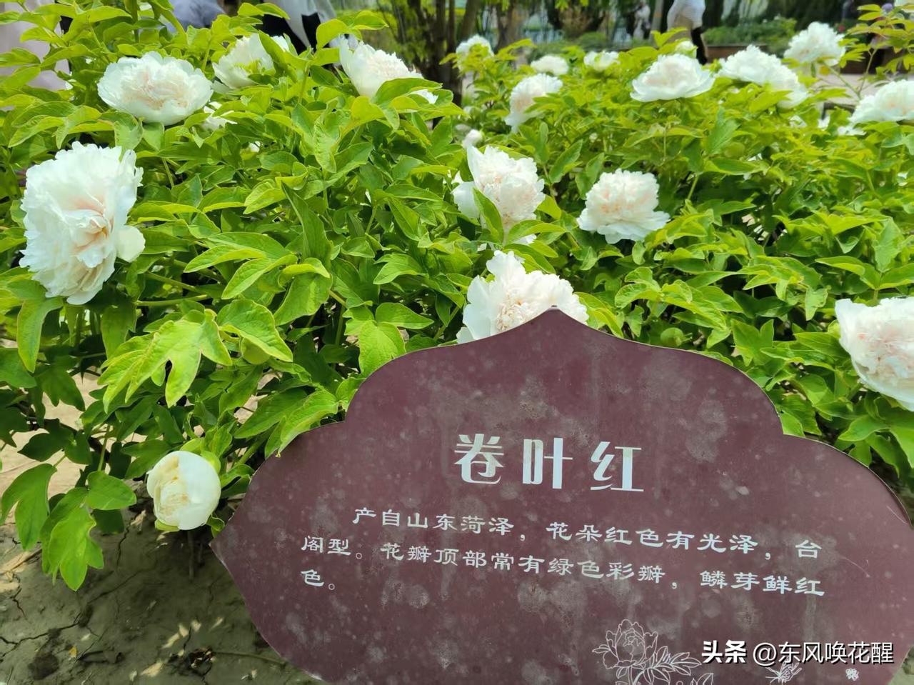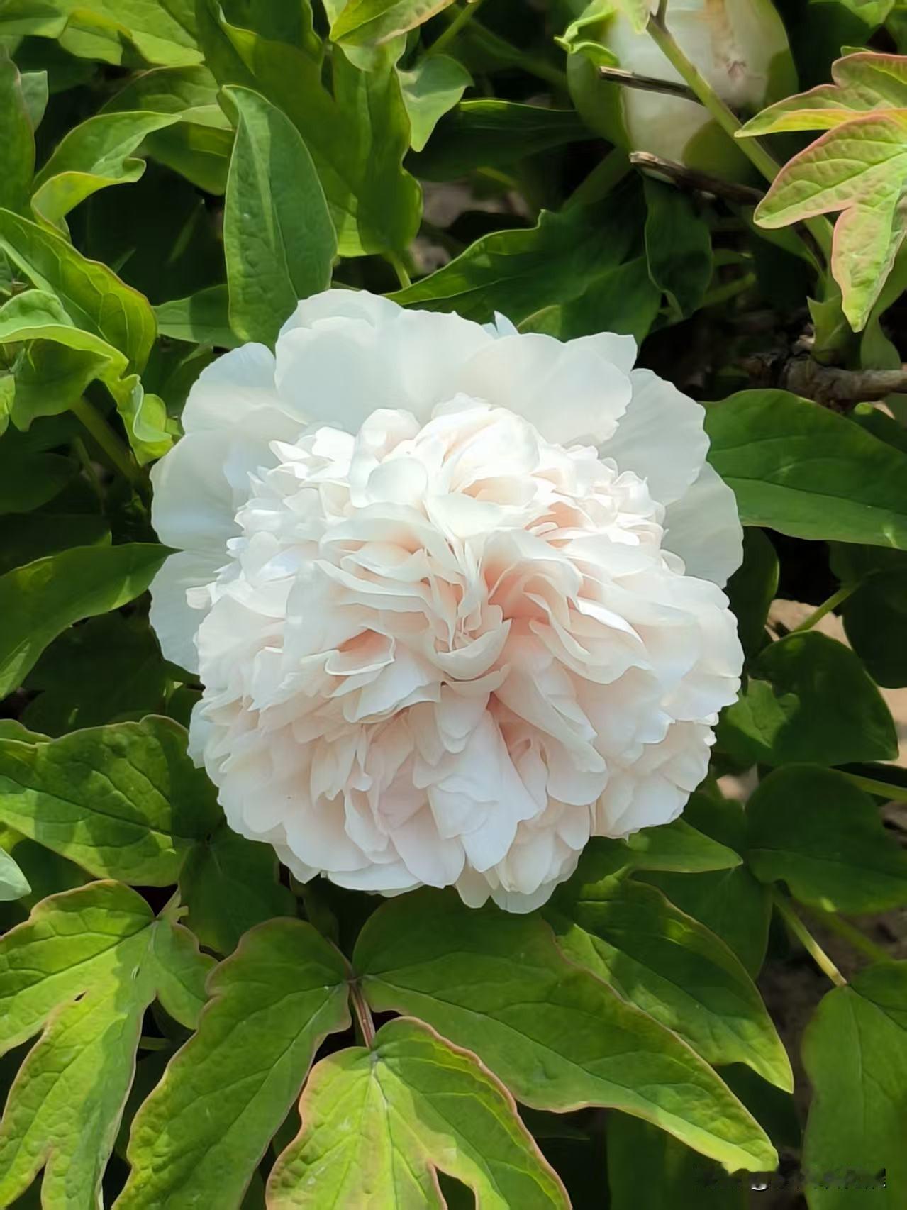 卷叶红,这个品种不像其它牡丹鲜艳,白里透着粉色,花瓣抱成一团,像是大家闺秀,端庄秀气。