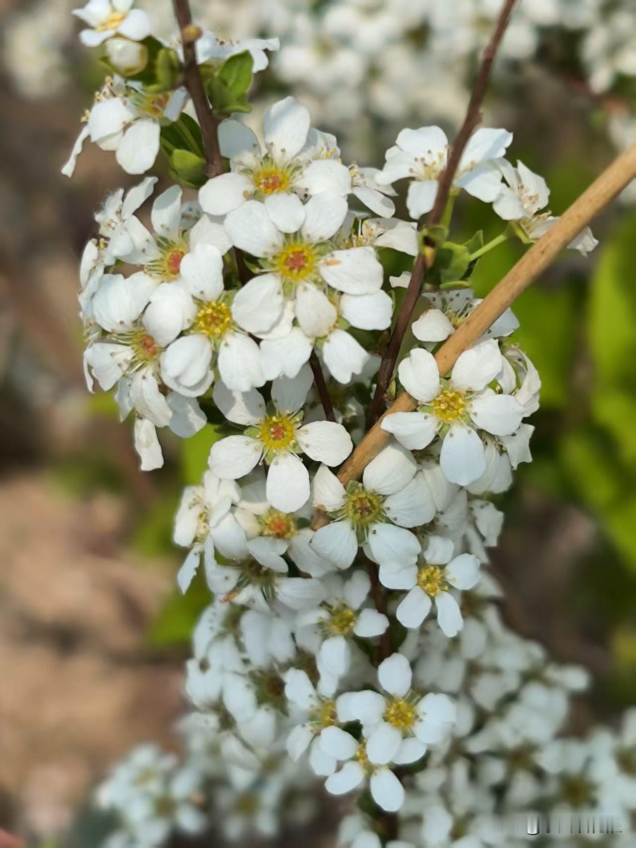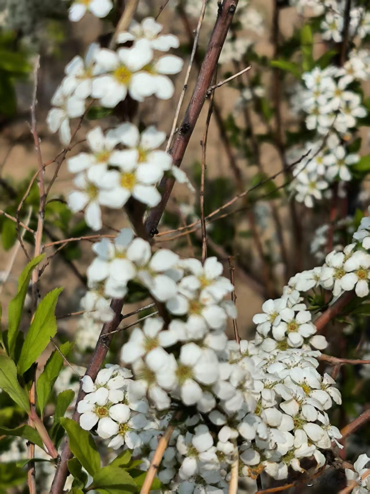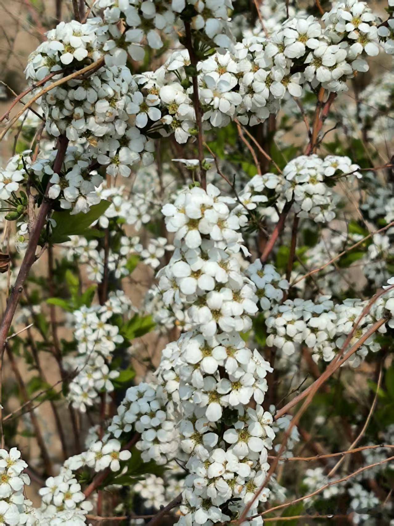 一朵朵小白花长在矮棵枝条上,一串串的,花朵繁茂,洁白秀丽,丛丛叠叠,枝条被细巧的白花覆盖,一片雪白宛如积雪,微风拂过,小小花朵像成片的雪花飘落下来,一幅柔美的样子,十分惹人喜爱。[比心]