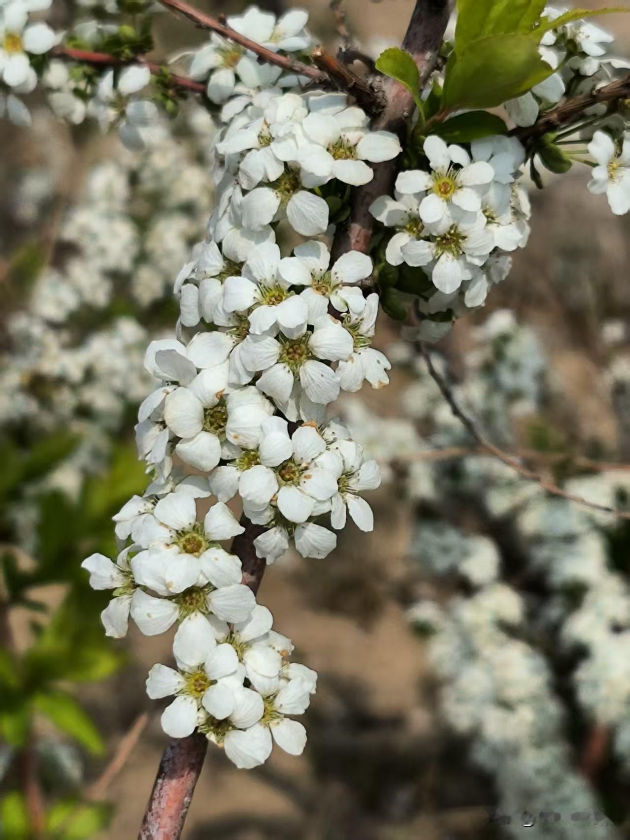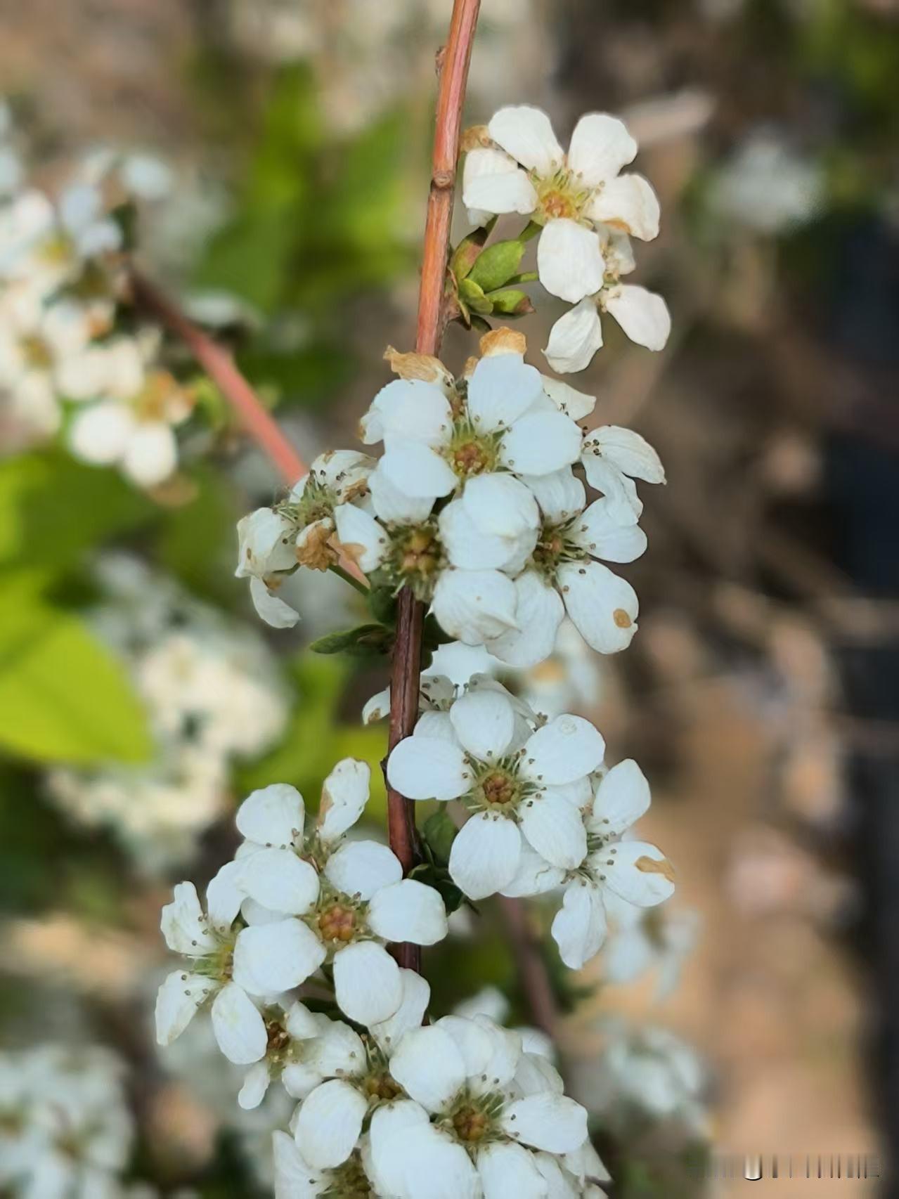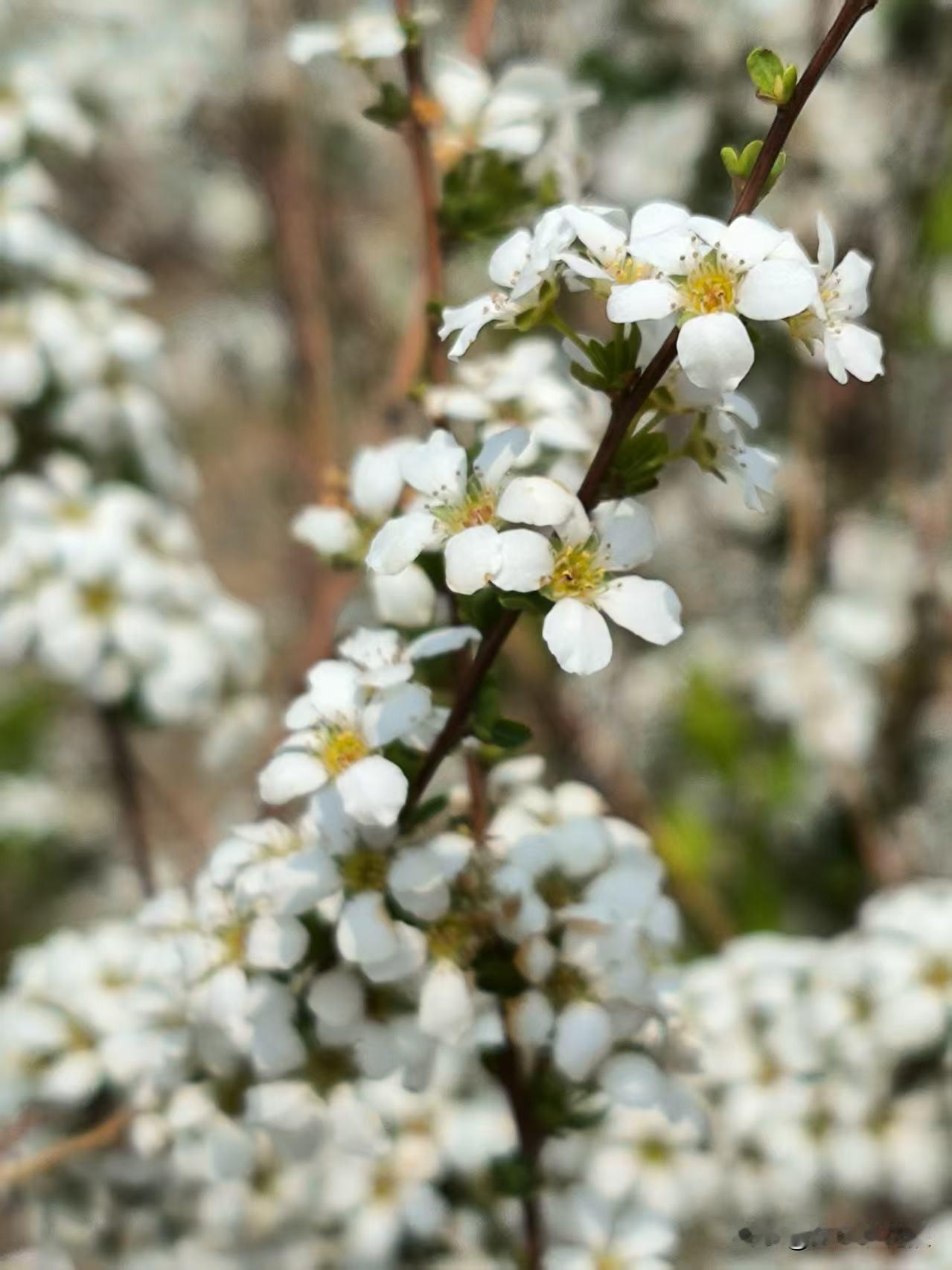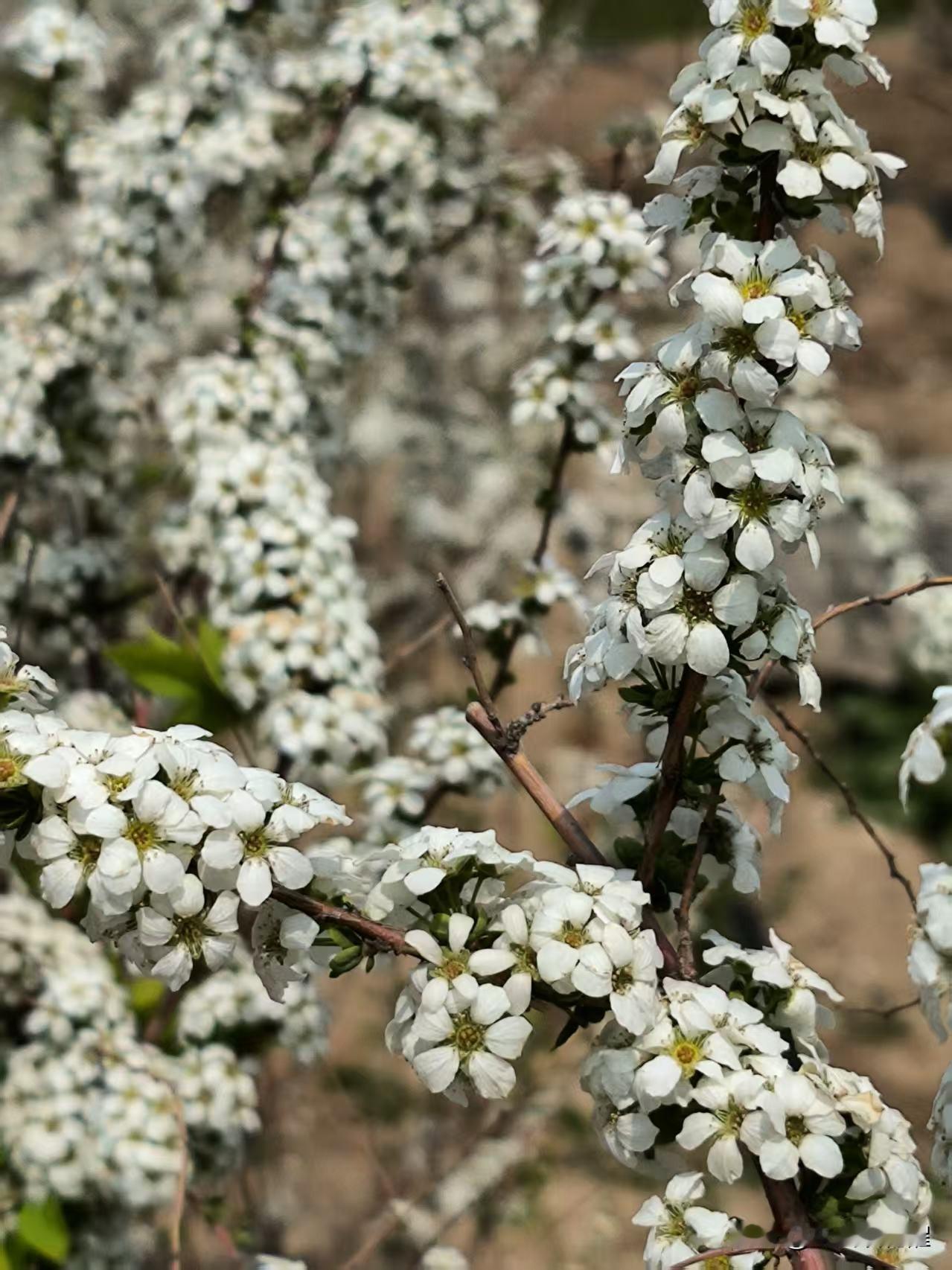 一朵朵小白花长在矮棵枝条上,一串串的,花朵繁茂,洁白秀丽,丛丛叠叠,枝条被细巧的白花覆盖,一片雪白宛如积雪,微风拂过,小小花朵像成片的雪花飘落下来,一幅柔美的样子,十分惹人喜爱。[比心]