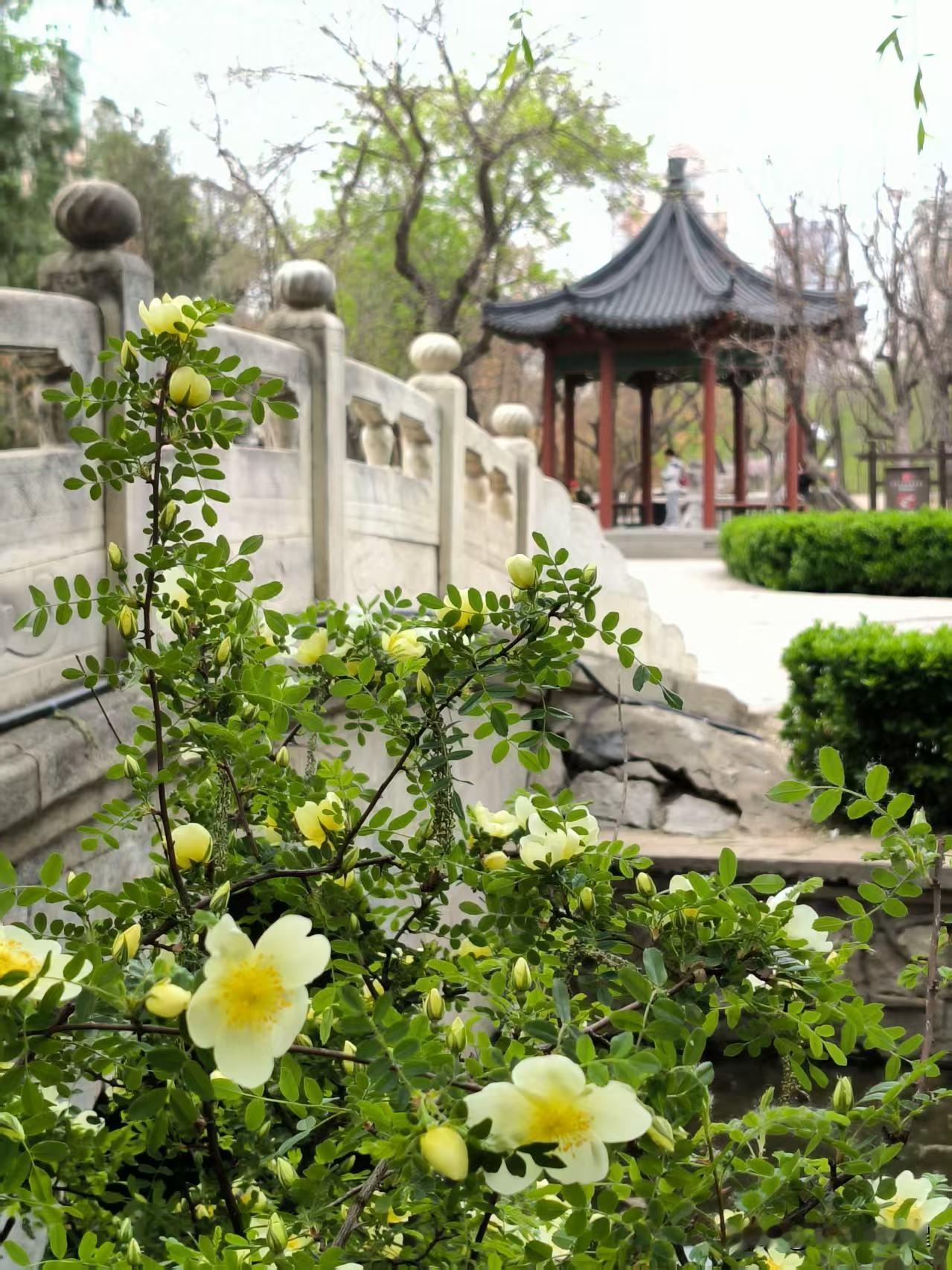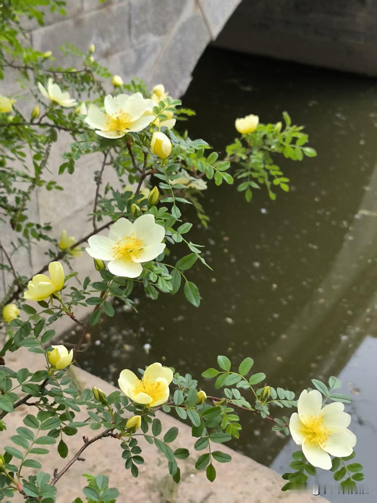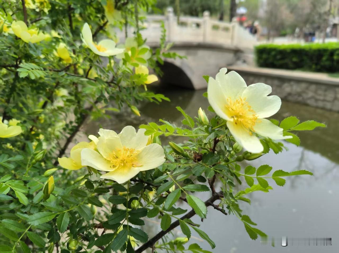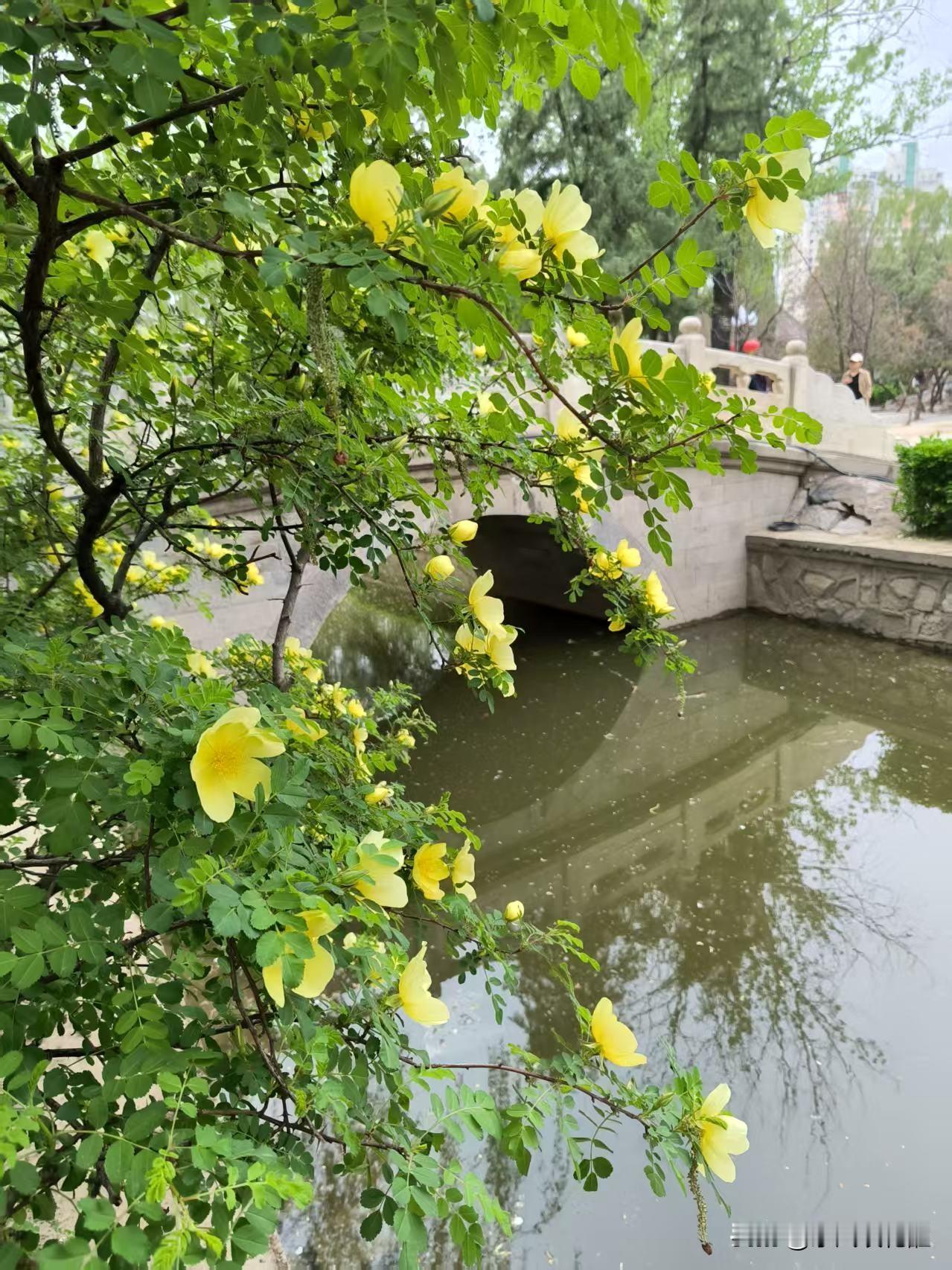 这是在人民公园里拍的,在湖的岸边有几簇黄刺玫树,每年快到暮春时盛开,花朵茂密,一条枝干上开满了黄花。这是单瓣黄刺玫,离着不远处还有一棵双瓣黄刺玫,因为有竹林遮挡还没开花,双瓣花盛开后也特别漂亮。