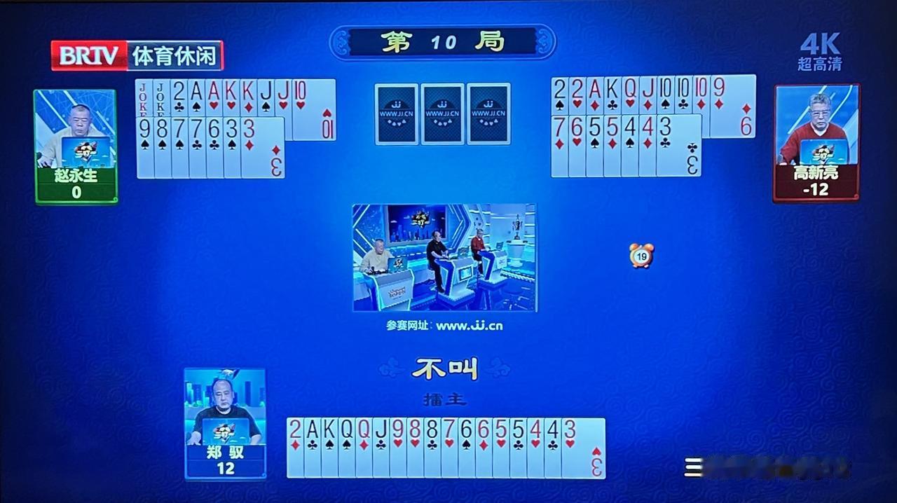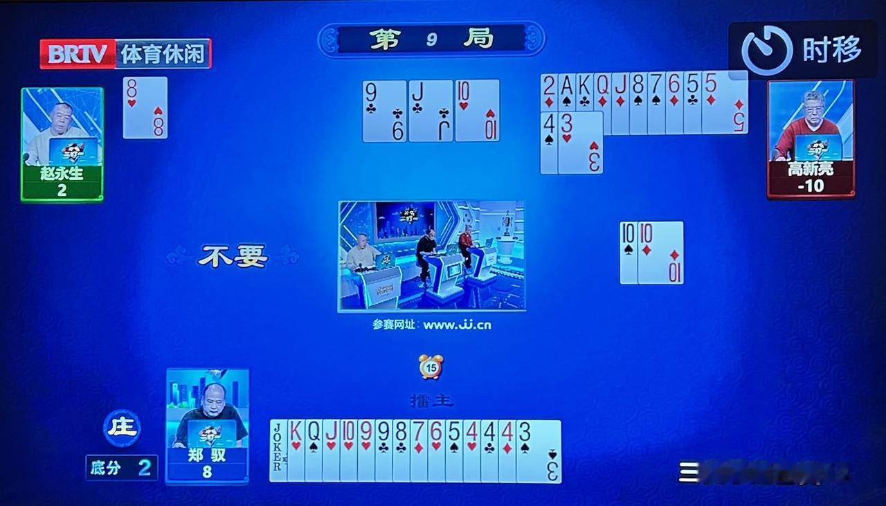 第九局最后,下家农民明明只剩一张,这位高新亮上手后不是打对,就是顶2,就是不放下家农民朋友走。