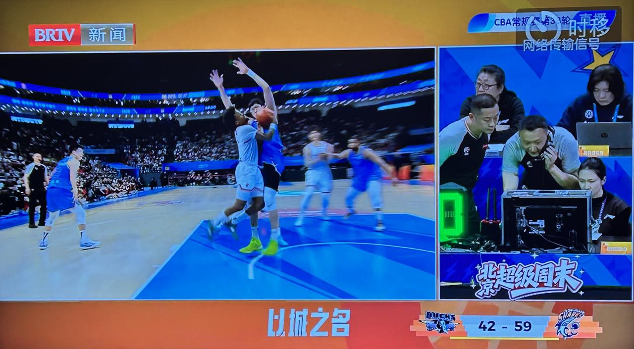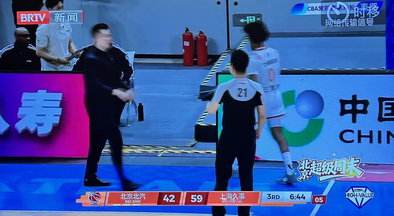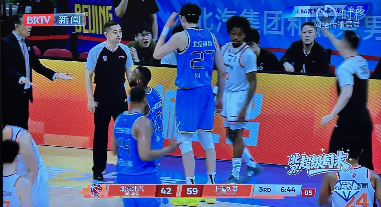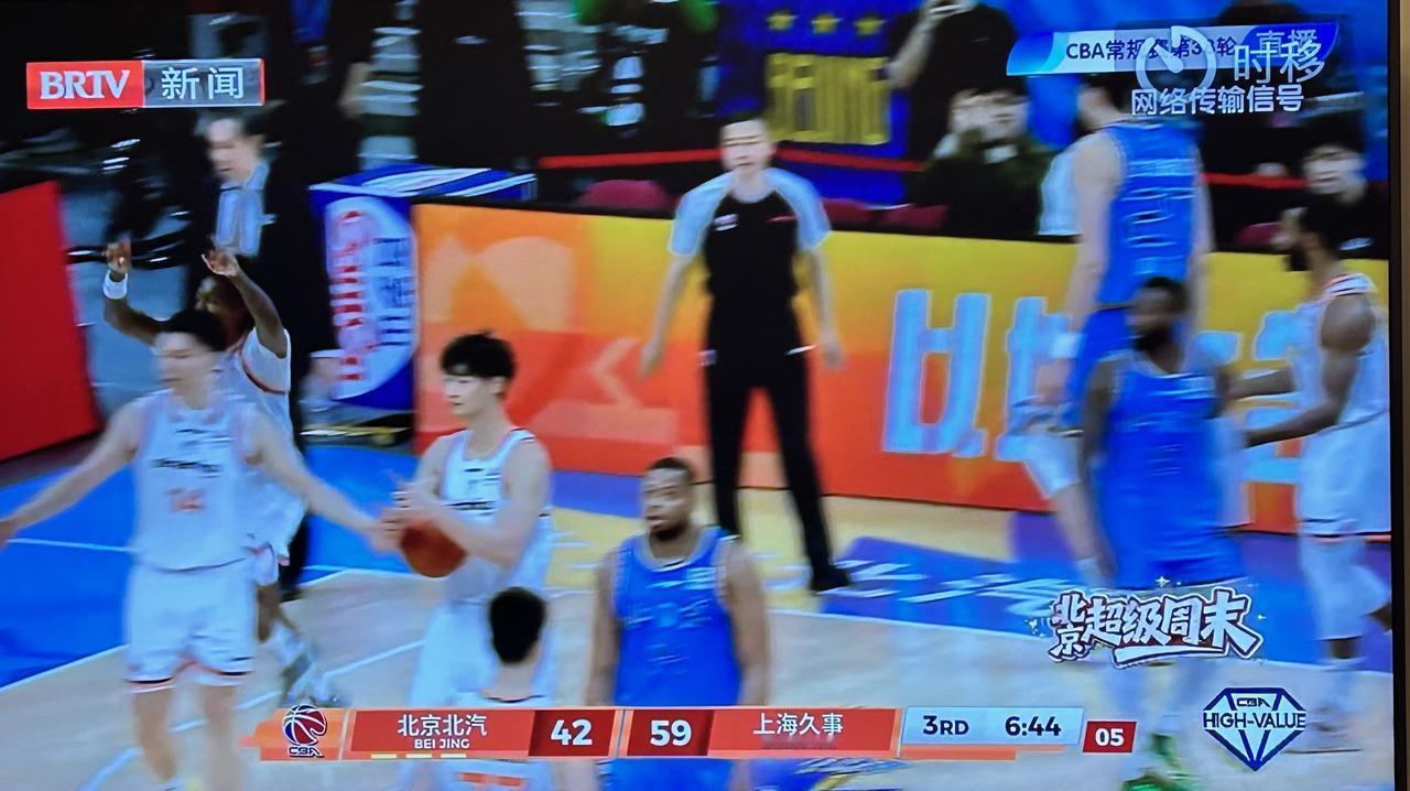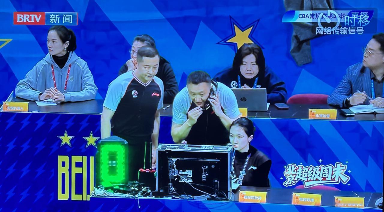 底线裁判判罚上海球权。此时,站在远端边线的闫军疾步上前,改判球权归北京。