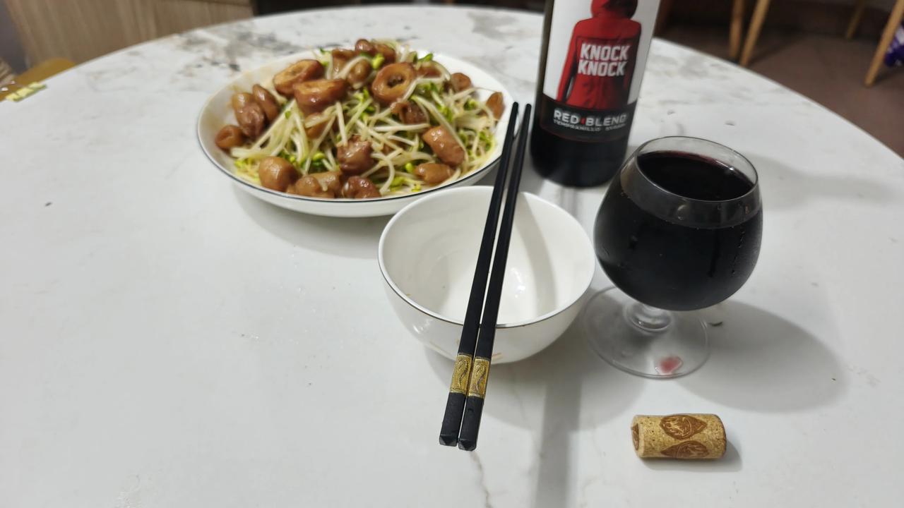 晒出你的今日美食这就是我今晚的所谓美食,我们广州人有句俗语,叫大皇唔食辣椒酱,大豆芽菜炒猪肠。我还有半瓶前几天喝剩的红酒,幸亏还未有馊,如果馊了就真是很浪费。