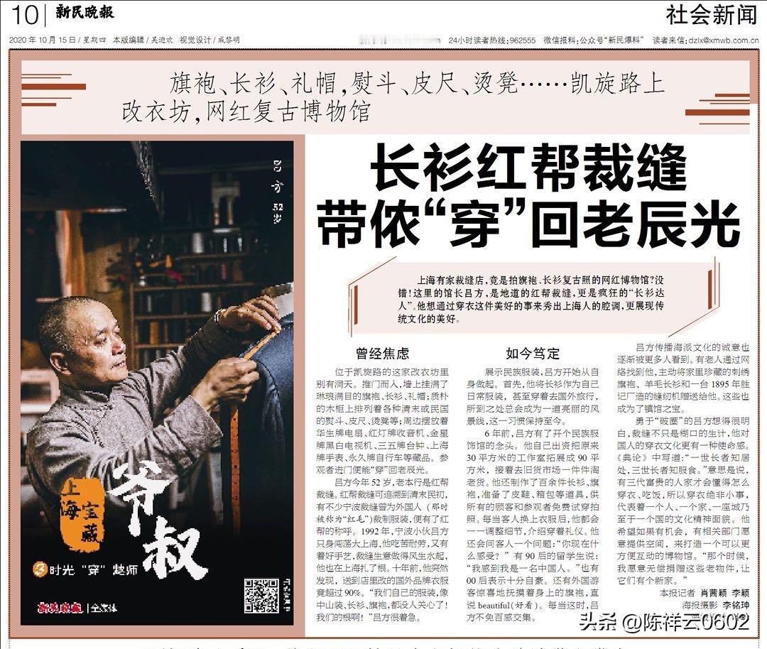 一语解惑,更让我意外的是,眼前这位看似随性的师傅,竟是上海裁缝界赫赫有名的高手与“大神”——吕方。他的故事,早已登上央视新闻、上海本地电视台,亦在网络与报刊中被多次报道。