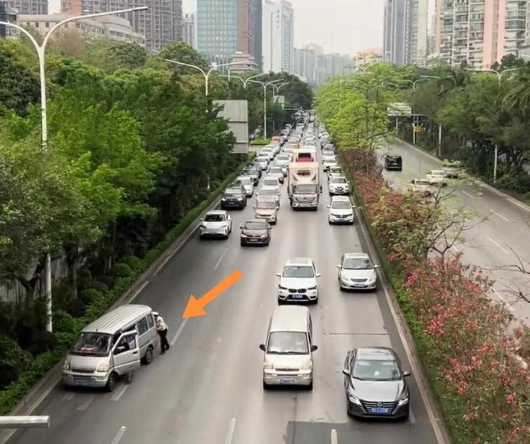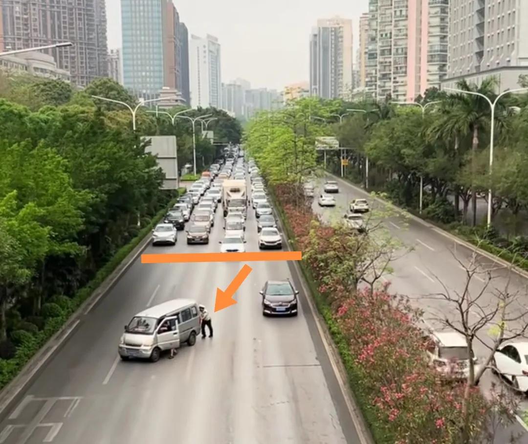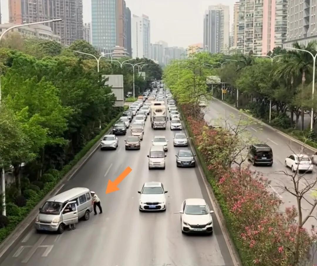 广西南宁主车道上一交警帮推熄火的面包车,其他车辆一字排开等候不抢行。