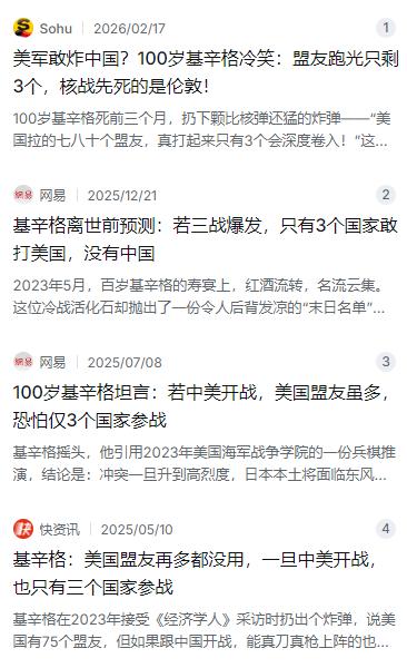 一旦中美开战,美军将全面轰炸中国?100岁的基辛格早就发出过警告:“美国盟友再多也没有用,一旦中美两国开战,最后参战并站队美国的国家只有三个!“国家之间拉帮结派,说白了就是个利益交换,嘴上喊着共同价值观,心里盘算的都是自家的小九九,真到了要让你抄家伙替别人卖命的时候,谁都得先掂量掂量,自己会亏多少,又能捞到啥好处。