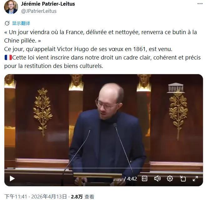 法国国民议会170 票全票通过文物归还法案,连议员都直言:雨果期盼的这一天,终于到来了!必须为法国点赞,这是直面历史、尊重文明的正义一步。
