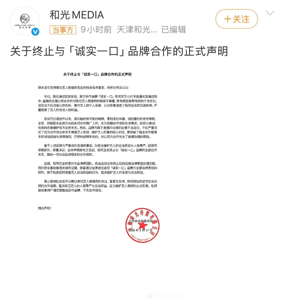 诚实一口原定今天官宣离谱到家了……从网传官宣节奏来看,郝熠然与诚实一口商务合作原定今天在各大平台官宣,结果半路杀出个程咬金……