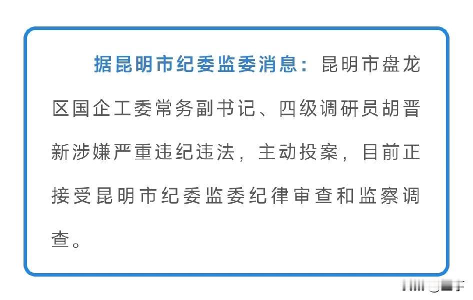 2026年4月13日,昆明市纪委监委发布通报,盘龙区国企工委常务副书记、四级调研员胡晋新涉嫌严重违纪违法,主动投案,正接受纪律审查和监察调查。作为辖区国企党风廉政建设的直接责任人,他的选择既是个人迷途知返的清醒,更是十五五开局之年昆明纵深推进国企反腐、刀刃向内整治"灯下黑"的鲜明注脚。