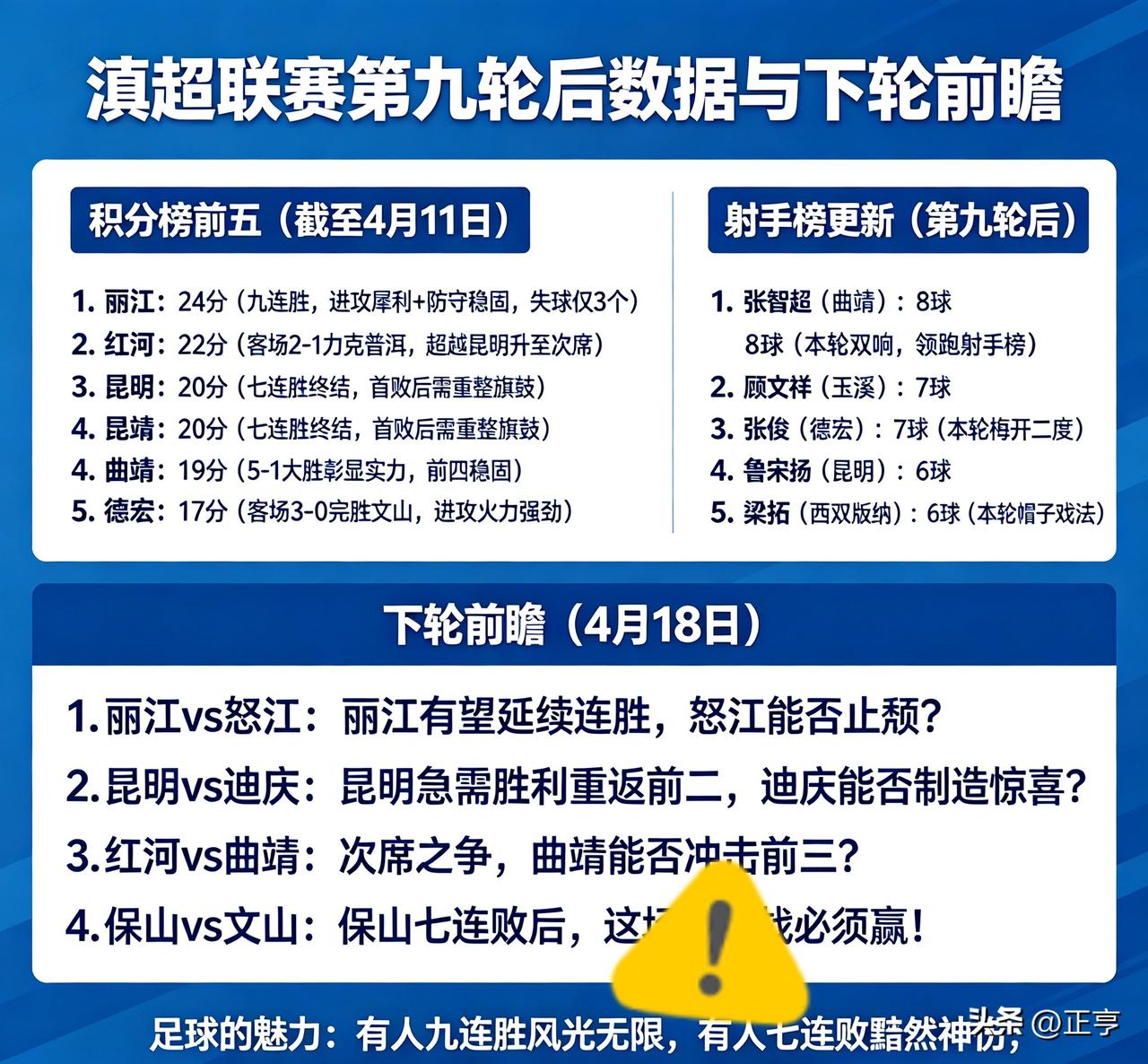 4月11日,滇超联赛第九轮全面开战,八场对决同时点燃云南足球激情,榜首格局剧变,黑马逆袭,冷门频出,每一场都写满故事感。