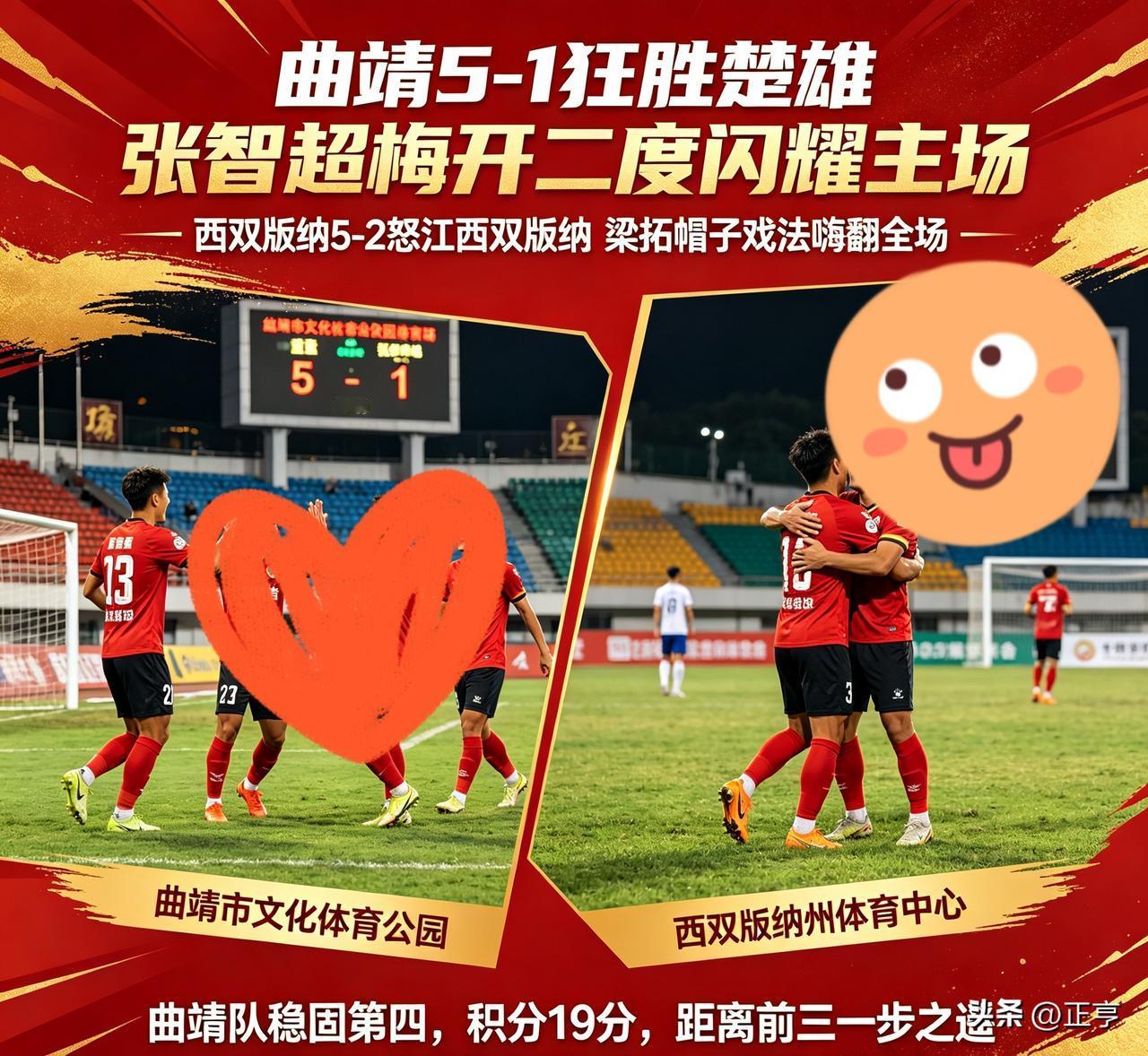 同天15:00,曲靖市文化体育公园体育场,曲靖队火力全开,5-1横扫楚雄。张智超上演梅开二度,和董董、吕明浩、张晓波各入一球,五粒进球点燃全场。这场大胜让曲靖稳固第四,积分19分,距离前三仅一步之遥。