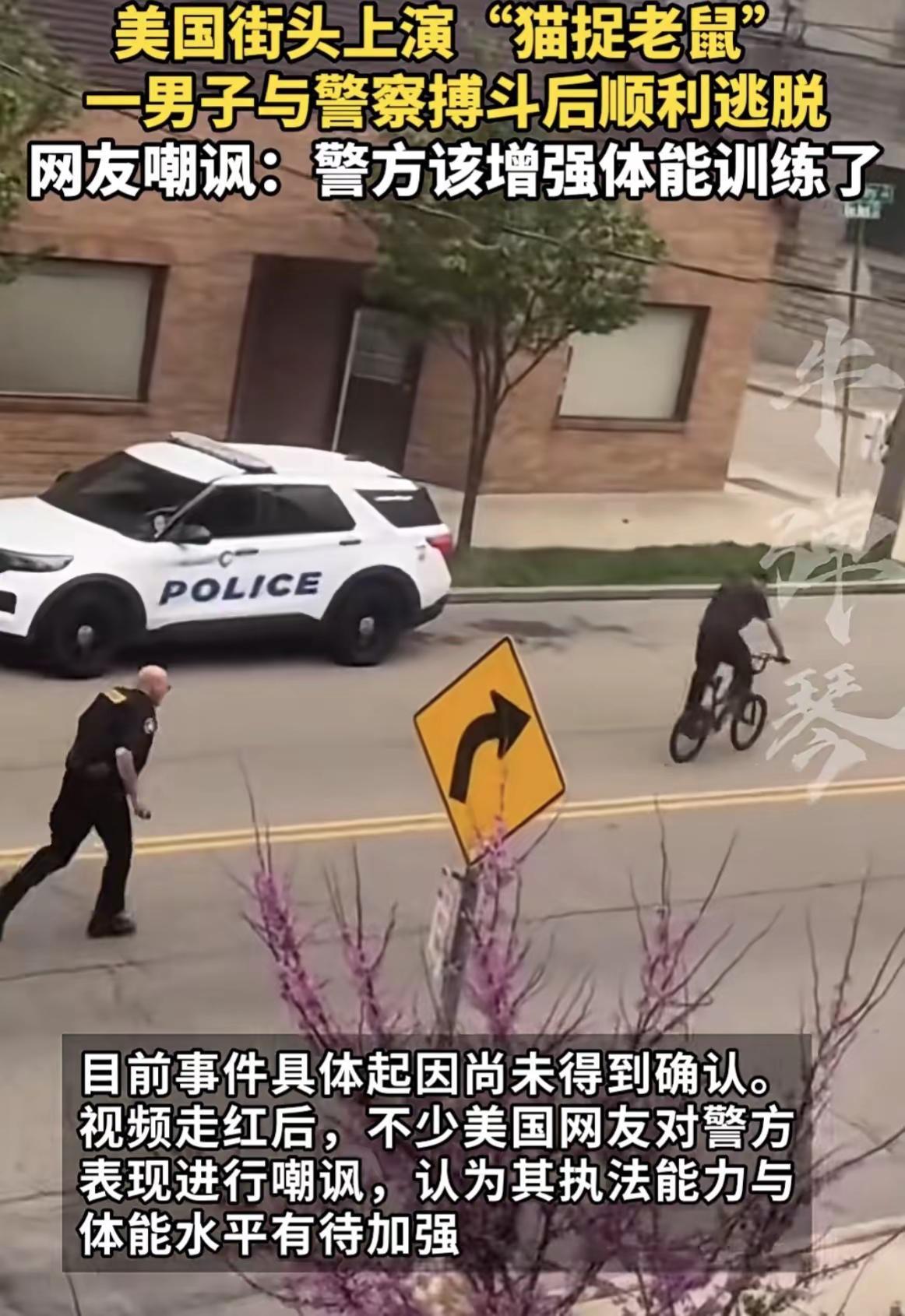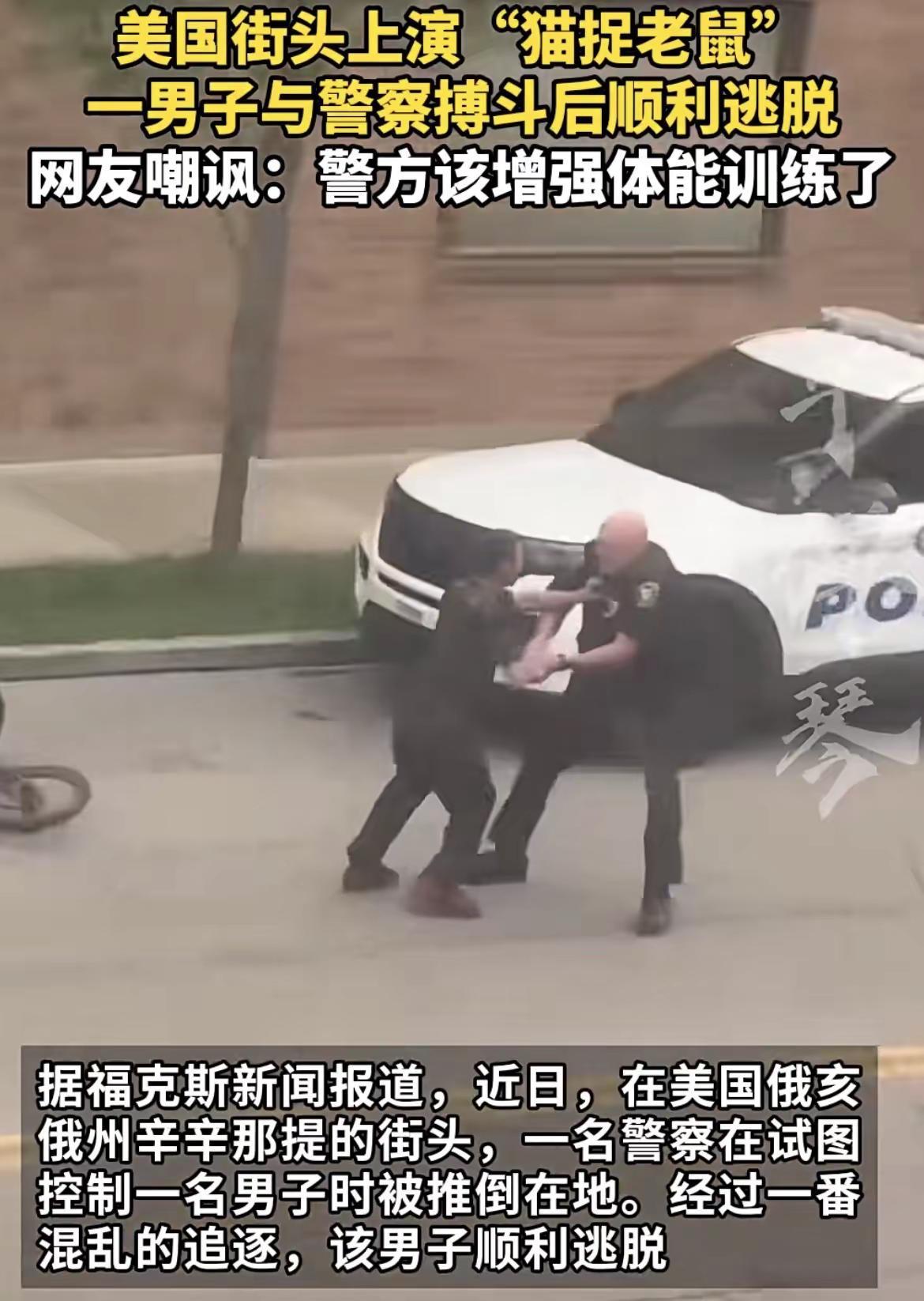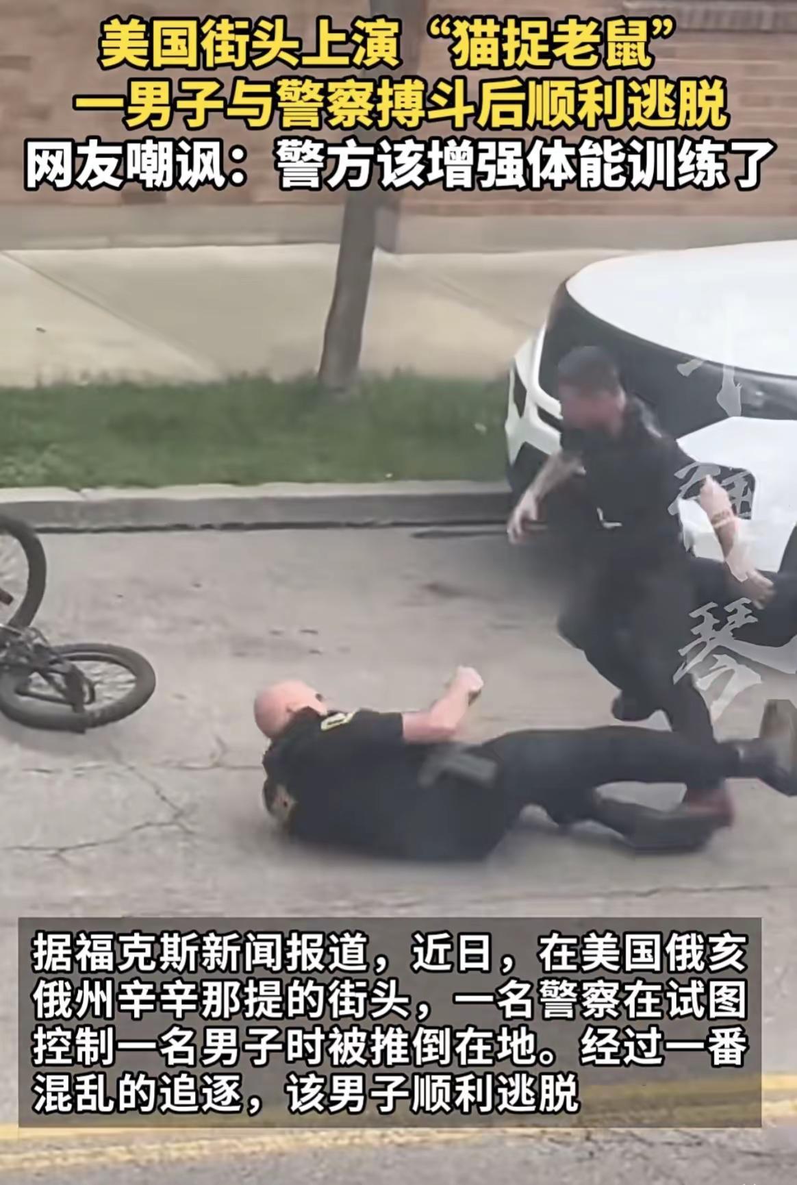 猫被老鼠玩的游戏。这是“猫被老鼠玩”啦,美国街上的警察与平民搏斗场面被嘲讽看了一个视频、本不该发出笑声的哈!但确实忍不住,那个场面出现的是一名高大美国警察,不知道什么原因,与一个瘦瘦的平民,相互摔跤、搏斗的场面!只看瘦高个的平民,将胖高个的警察一个抱甩在地,警察哼哧哼哧的爬了起来。在追逐瘦高个的时候,好像手里还有一瓶喷辣椒的玩意,不知道是不是吃的有点手抖,喷了几下、却没有喷到瘦高个平民的脸上,不起作用!灵活的瘦高个平民直接从胖高个警察胸前川过,在追逐过程中,警察与平民绕圈跑了几圈,不知道。反正就差那么1毫米的距离,警察就是抓不住平民,当然有的人在想,及时抓住了,可能这个胖高个的警察依然制服不了瘦高个的平民反抗!整个过程看起来,就是这个瘦高个的平民在与胖高个的警察玩游戏,那就是“猫被老鼠”玩的游戏!最后,瘦高个的平民一腿跨上他的自行车,一溜烟的跑了!后面直喘粗气的胖高个警察还不想放过,吭哧、吭哧地追上去,眼睁睁地看着自行车,远离而去!整个过程中,幸好没有人扒枪,不管是警察还是平民,他们身上到底有没有枪 不知道!看来仅仅是“猫被老鼠玩”的游戏,而没有动真格的开枪,这就算比较幸运的喽。(图片 内容来自网络?如有侵权立删! 情节有些许 虚构,请谨慎阅读!)
