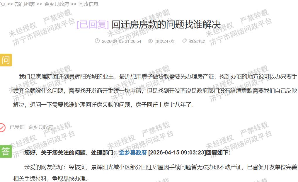 【金乡回迁房上房多年办证遇手续难题】据济宁市网络问政平台消息,金乡县景辉阳光城小区部分回迁房业主反映,房屋上房已七八年,近期因贷款需要办理不动产证时遇阻 —— 办证部门称手续齐全即可办理,但开发商以政府部门未结清房款为由拒绝开具相关手续,导致业主陷入 "办证无门" 的困境。4月15日,金乡县政府回复称 "因手续问题暂无法办理不动产证",并表示已督促开发单位完善相关手续材料,争取尽快办理。