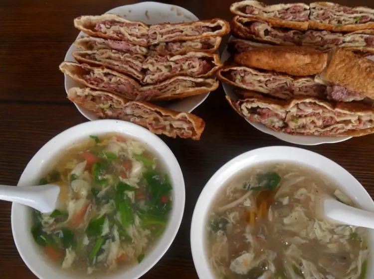 刚出锅的壮馍沉甸甸的,拿在手里有压手的质感,外皮焦脆,一碰就掉渣。用刀十字切开,层次瞬间显现,薄如纸的面皮裹着丝絮般的肉馅,十几层的纹路里藏着满满的诚意。咬下一块,外酥里嫩的口感在口中交织,麦香与肉香层层递进,越嚼越甜,越嚼越香。摊主说,从前武安的汉子赶大集、干农活,揣两个壮馍就能走几十里路,这厚实的馍里,藏着庄稼人对抗岁月的底气。配一碗现熬的糊粥,绵密的米香中和了壮馍的油润,一口馍一口粥,暖意从胃里漫到心头。