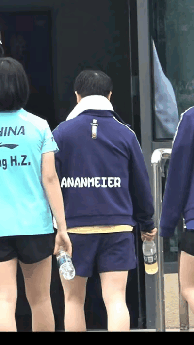 下训的莎莎,走路慢慢悠悠,和队医,陪练一起。