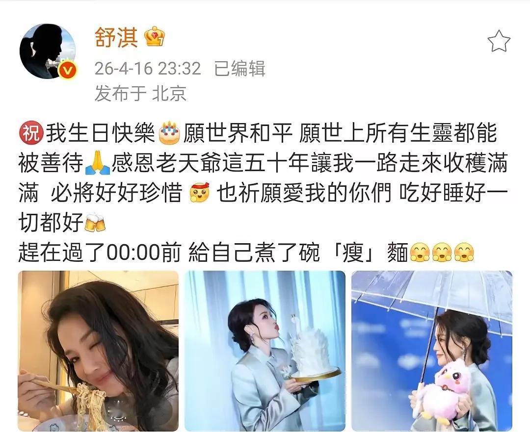4月16日,台湾省舒淇(林立慧)50岁生日吃鸡蛋青菜长寿面条。