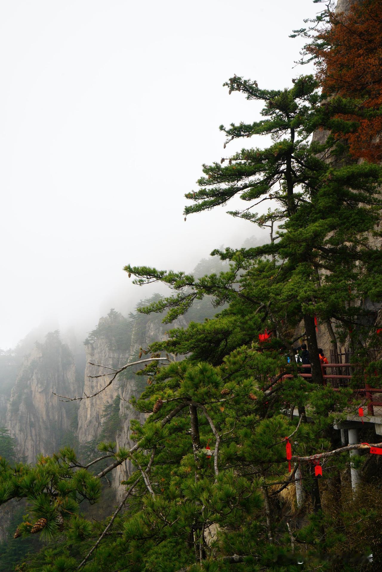 随拍老君山十里画屏,图中的祈福牌挂于悬崖峭壁中的的松树上,是怎么挂上去的?用拐杖跳出去挂的?