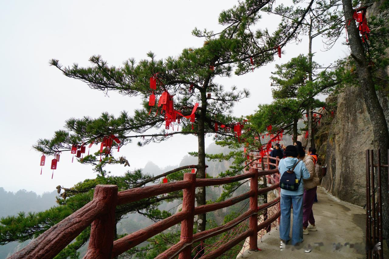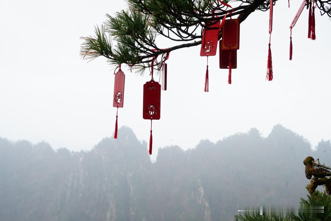 随拍老君山十里画屏,图中的祈福牌挂于悬崖峭壁中的的松树上,是怎么挂上去的?用拐杖