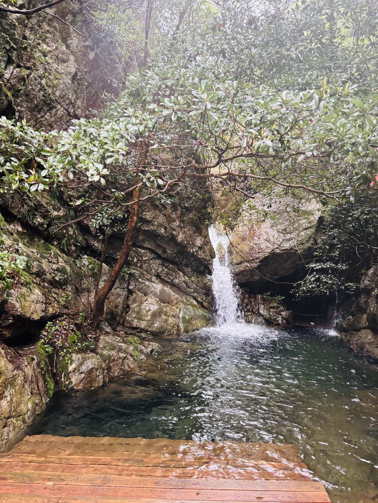 今天由于下雨的原因,游客特别少,只看到6个游客。潭水是活的。近处清澈见底,水草在水底轻轻摇摆;远处连着瀑布,泛着浅浅的蓝绿色,像一块温润的玉。瀑布不大,从十来米高的崖壁上挂下来,没有雷霆万钧的气势,却在跌落时碎成千万颗水珠。水声哗哗的,不急不躁,像是山在自言自语。
