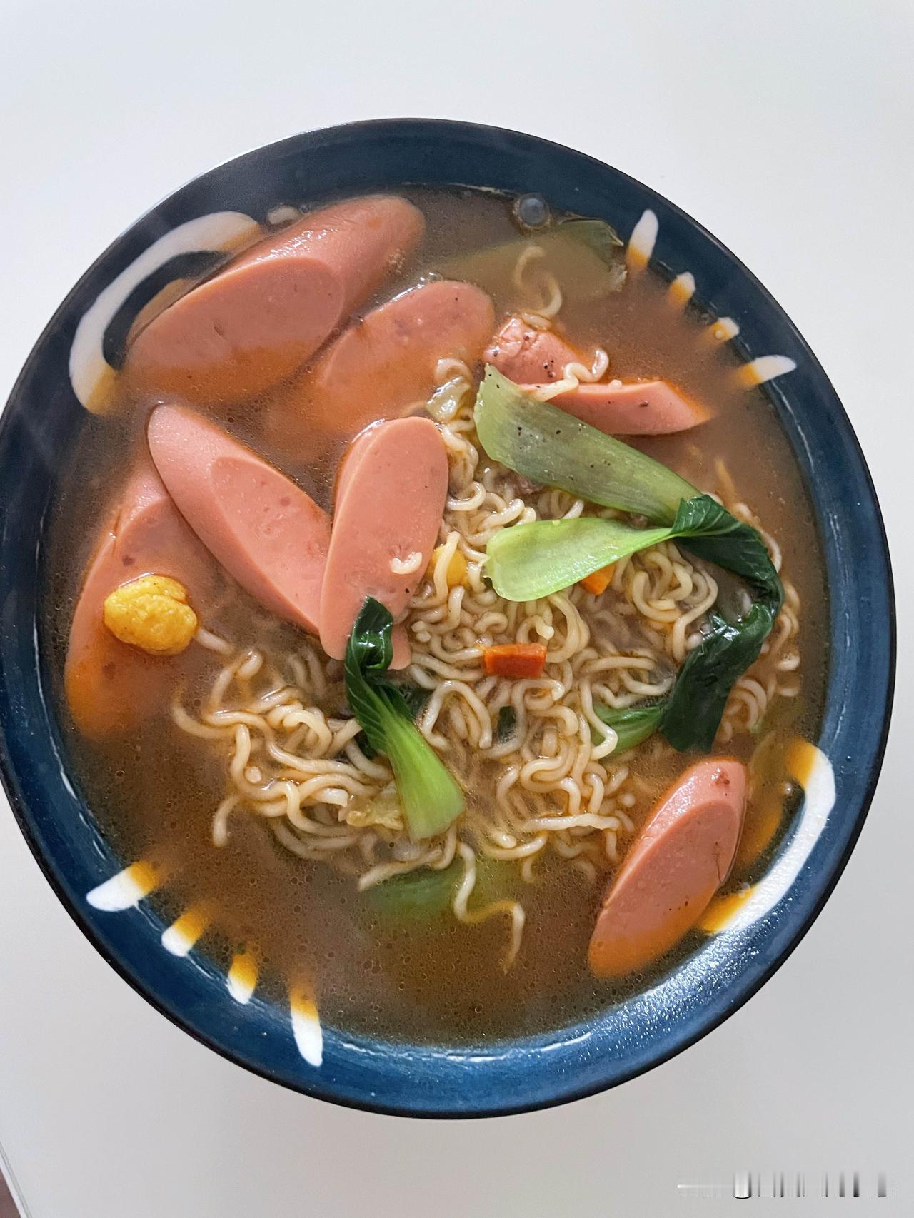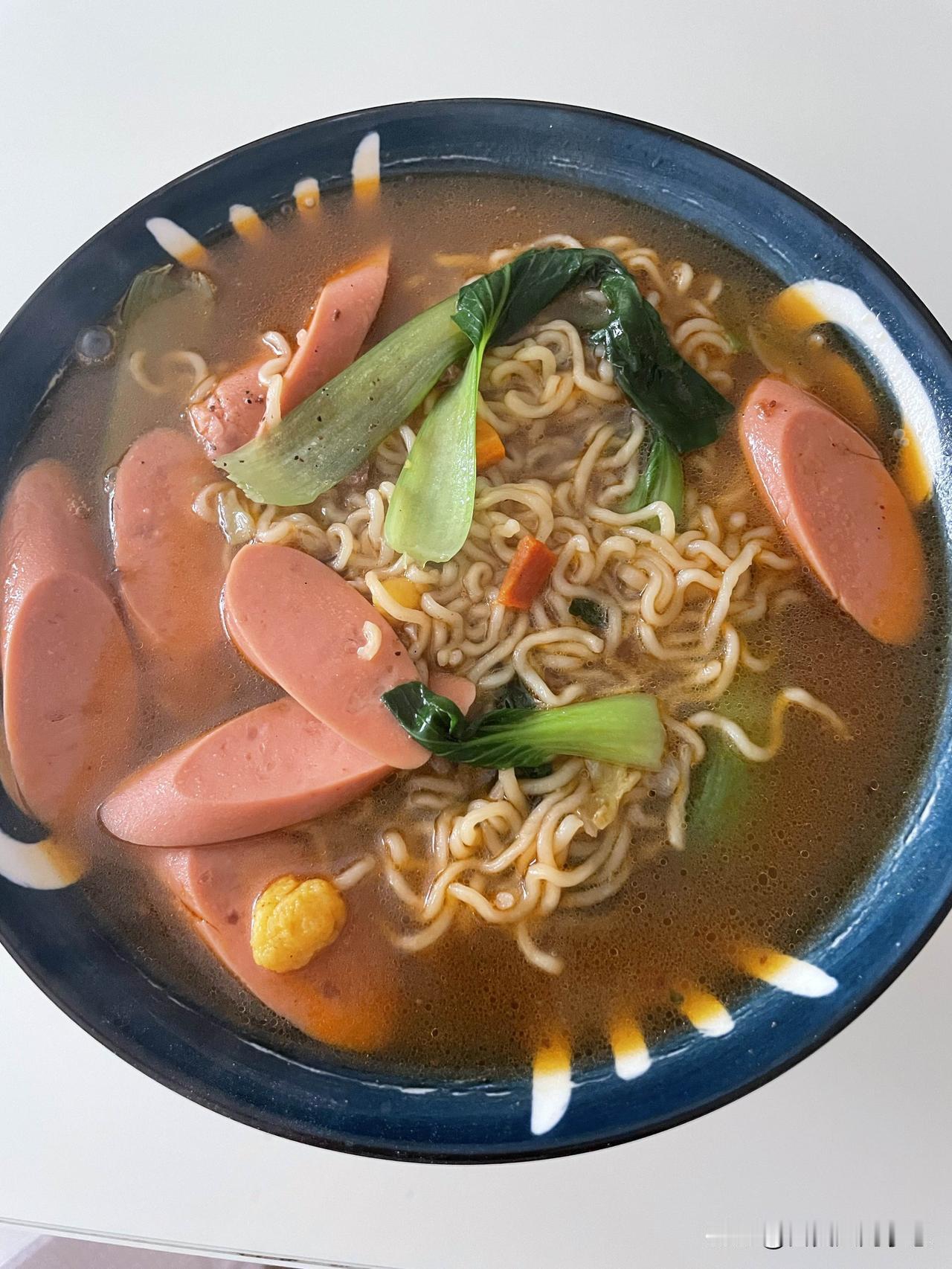 一包方便面一根火腿肠,两根青菜吃的很满足,时间长不吃,吃着很香,本来还想打一个荷包蛋的,想想算了,不是舍不得一个鸡蛋,是怕吃多了胖。