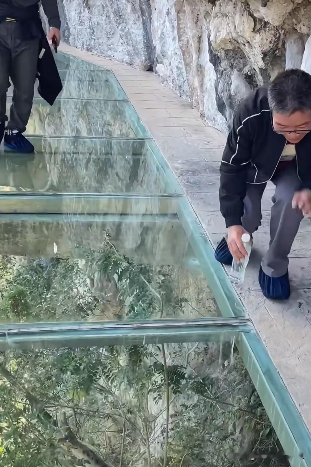 我扶着边上的栏杆走了一个来回,我老公走了几步又退回去了,其实开始我也害怕,虽然下面不是悬崖峭壁,但往下看一眼,还是害怕玻璃会碎掉掉下去。