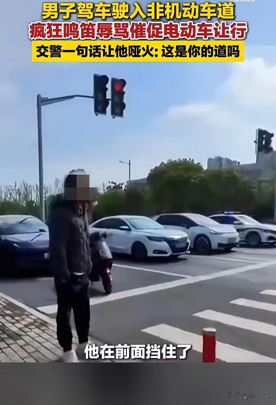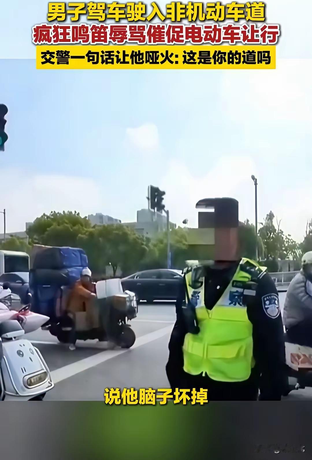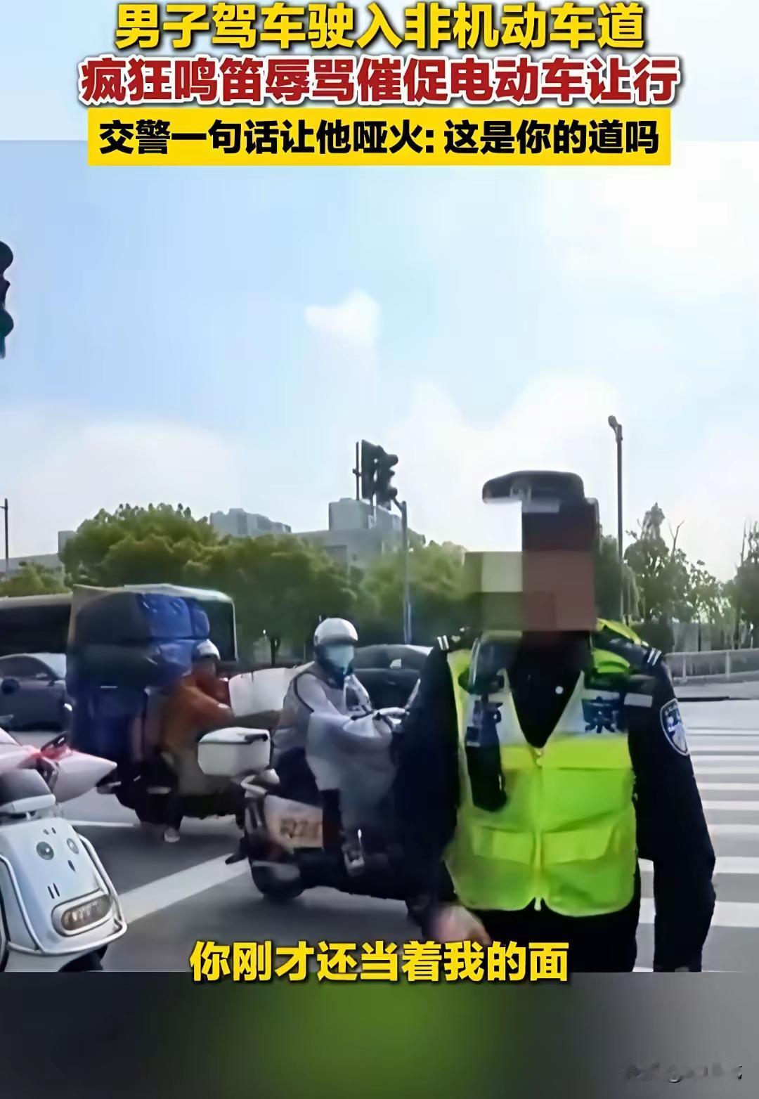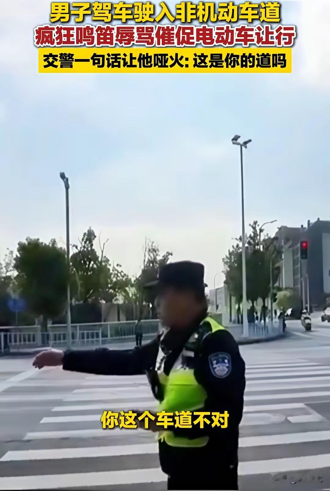 警察同志,对男子说这是你家的路吗?开车的男子也被说的哑口无言。明明是自己把车开到了非机动车道上还有理了。