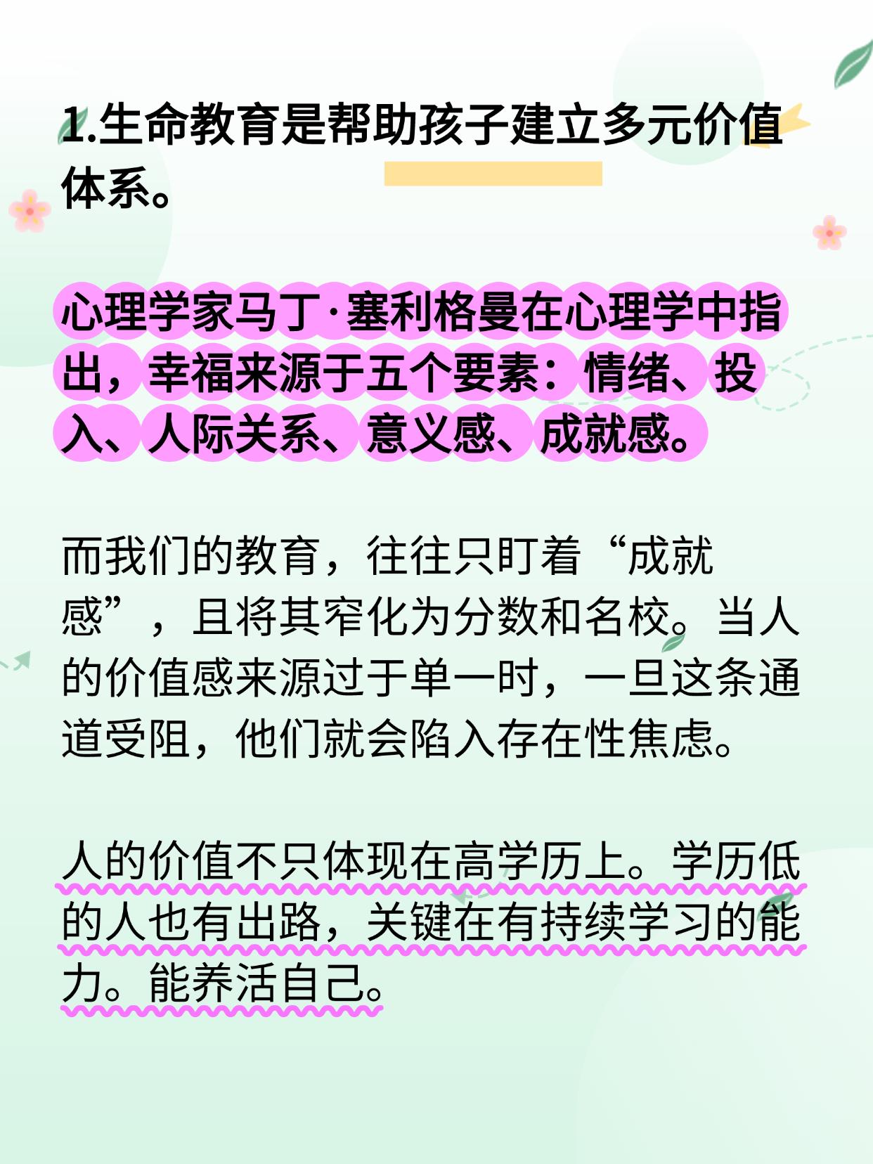 心理学家马丁·塞利格曼在心理学中指出,幸福来源于五个要素:情绪、投入、人际关系、意义感、成就感。而我们的教育,往往只盯着“成就感”,且将其窄化为分数和名校。当人的价值感来源过于单一时,一旦这条通道受阻,他们就会陷入存在性焦虑。人的价值不只体现在高学历上。学历低的人也有出路,关键在有持续学习的能力。能养活自己。