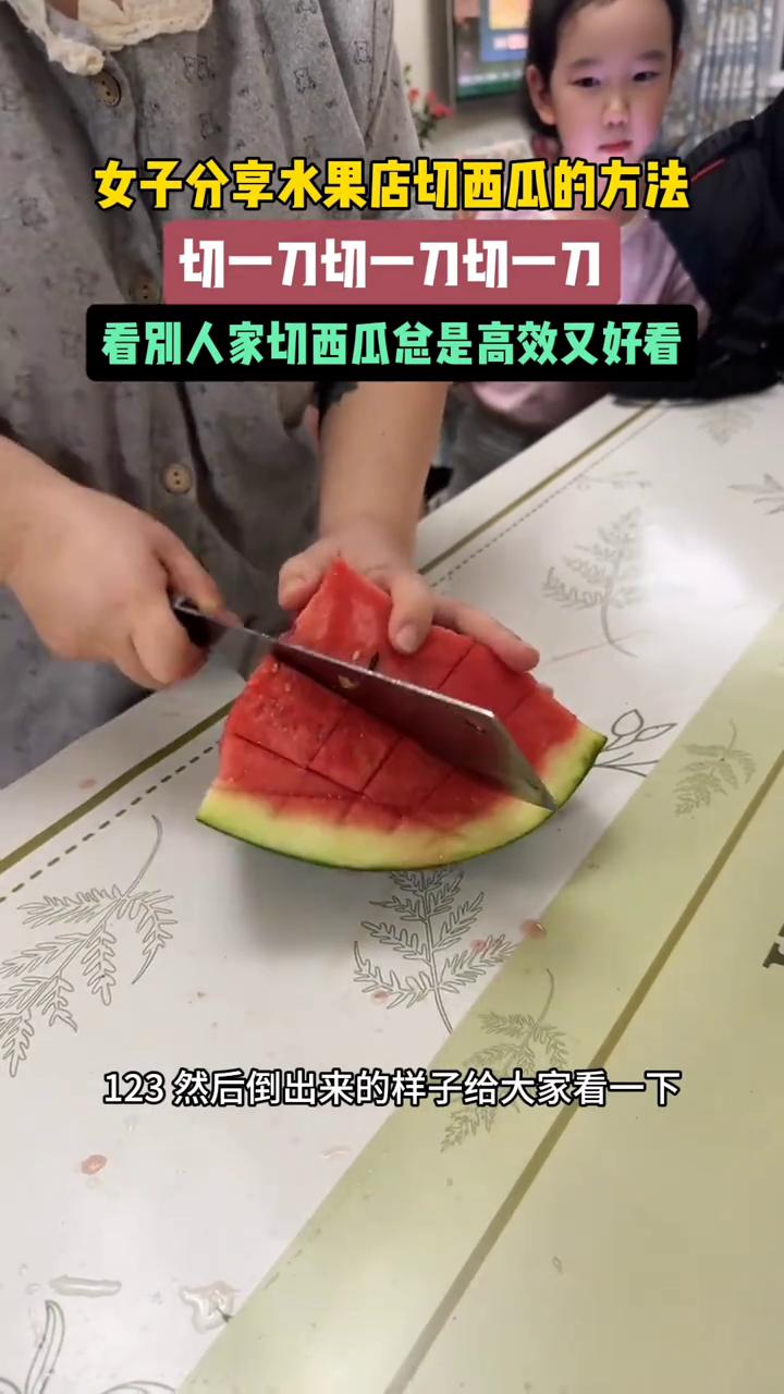 女子分享水果店切西瓜的方法,切一刀切一刀切一刀。