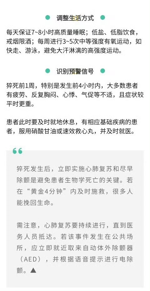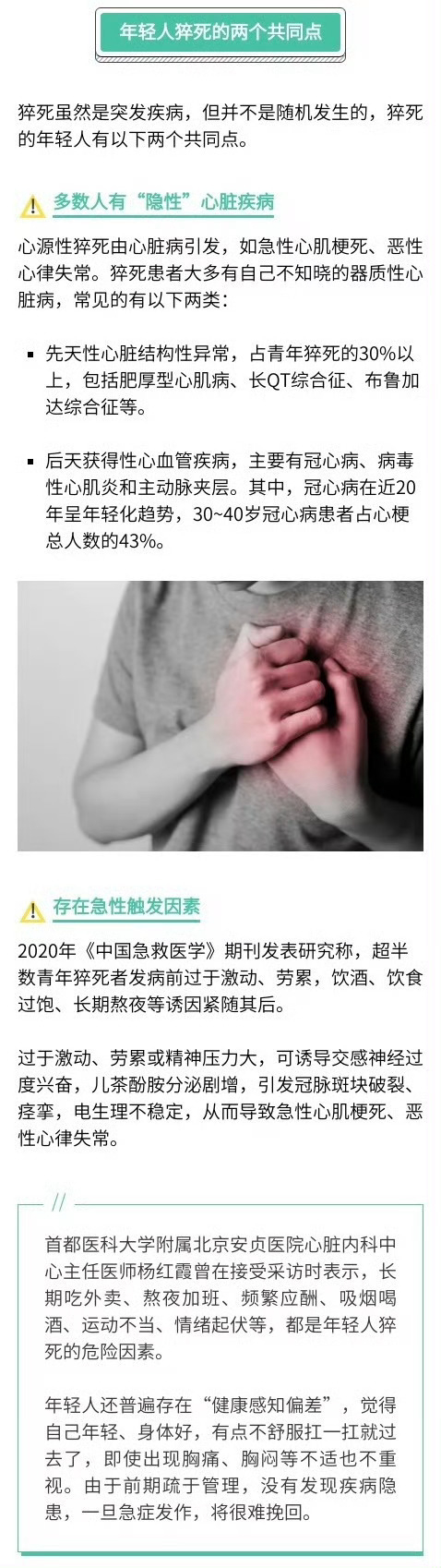 #青年猝死者具有三大特征# 【#我国每10秒约有1人死于猝死#】 中南大学湘雅医院心血管内科主任医师余国龙表示,猝死事件具有突发性和不可预测性,抢救窗口极短。在我国,每10秒约有1人死于猝死,其中90%以上发生在医院外;40岁以下人群占总猝死人数约40%。青年猝死者往往具有“无病史、无预警、进展快”三大特征,发病风险预警难度更大。(生命时报)#年轻人防猝死3个重点#