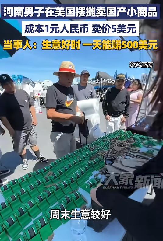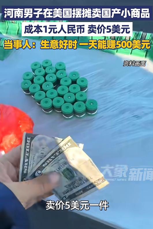 (信息来源:《河南男子在美国摆摊卖国产小商品,成本1元人民币卖价5美元,当事人:生意好时一天能赚500美元》大象新闻)