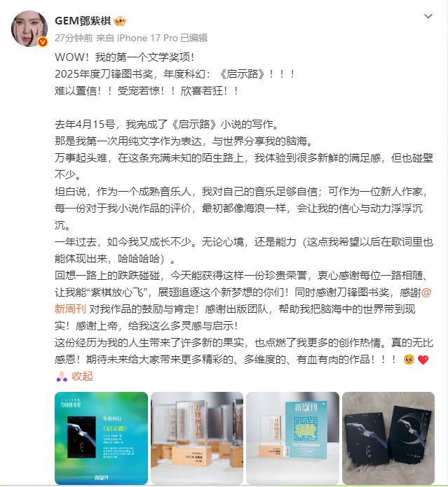 【#邓紫棋发文回应启示路获奖#】#邓紫棋第一个文学奖# 4月17日,发文:WOW!我的第一个文学奖项!2025年度刀锋图书奖,年度科幻:《启示路》!!!难以置信!!受宠若惊!!欣喜若狂!!