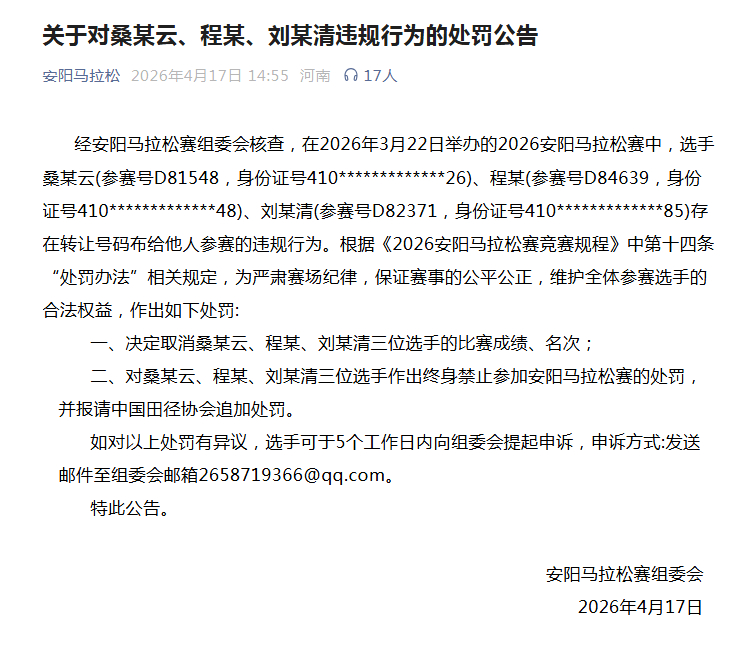 4月17日,红星新闻多次致电安阳马拉松组委会,工作人员表示,4月15日陆续接到网友举报,随即启动核查。