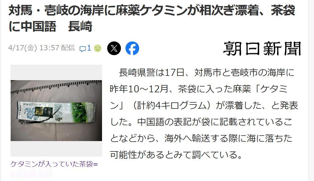 日媒《朝日新闻》4月17日报道:长崎县警方于4月17日宣布称:去年10月至12月间,装有“氯胺酮”(总共约4公斤)的茶叶包被冲上对马市丰玉町的海岸。 由于袋子上写有繁体中文,警方认为可能是在向海外运送时掉入海中的。