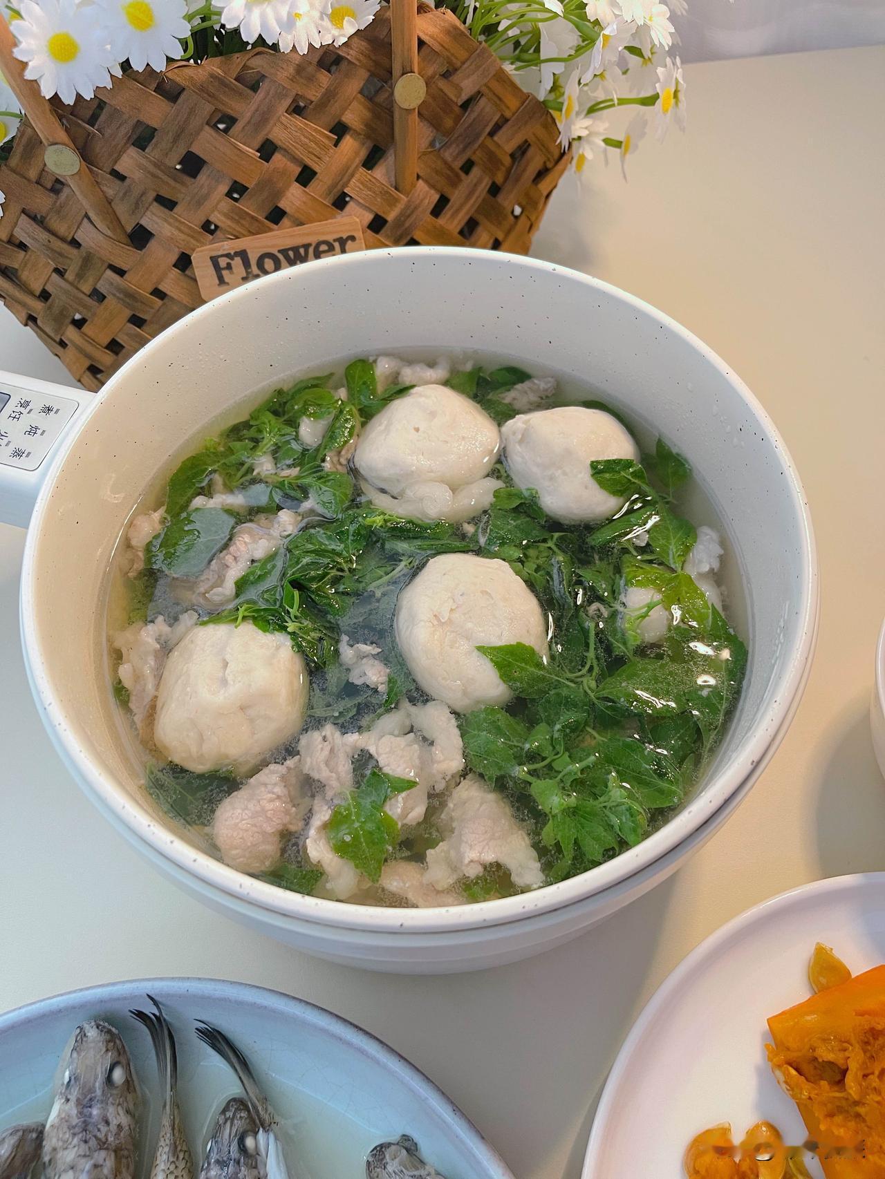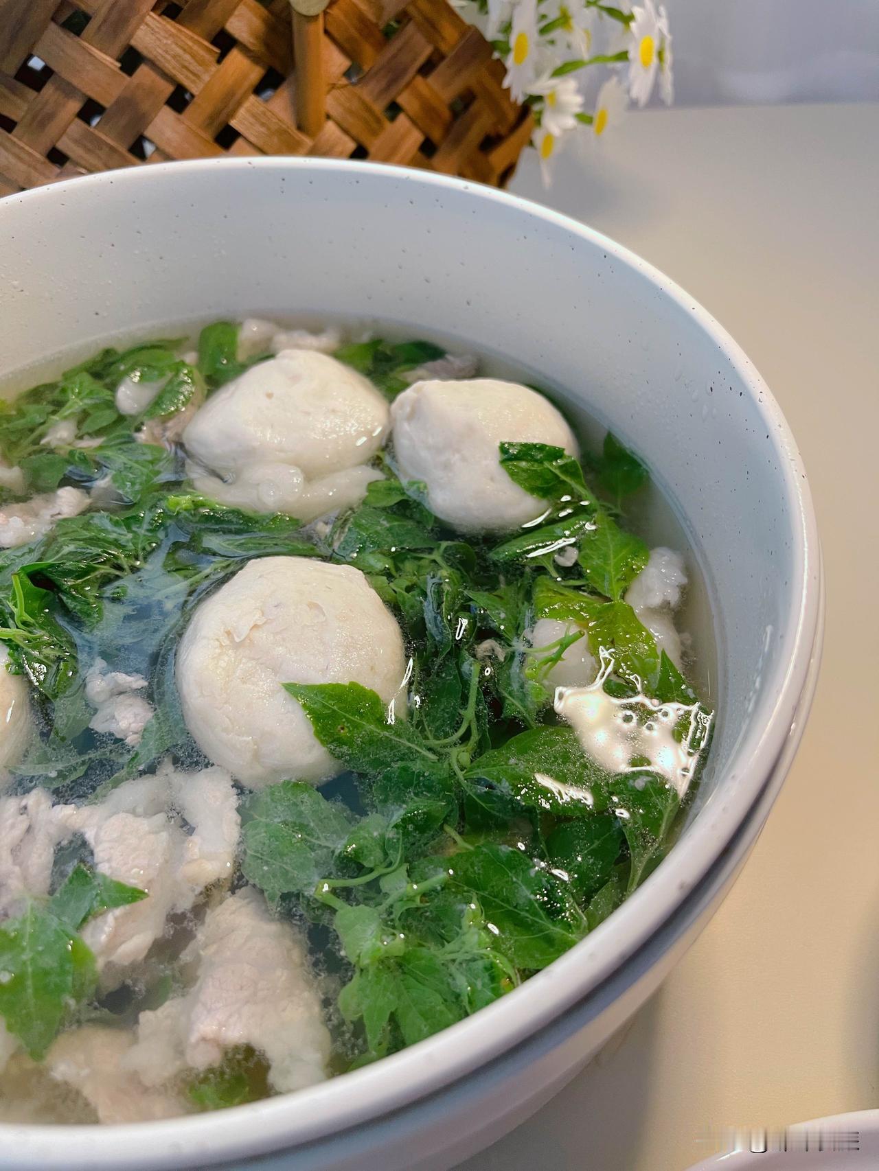 今天有短时雷阵雨,雨后天气闷热,顺应时节,煮一锅春天才能吃到的苦刺心鱼丸汤,微苦
