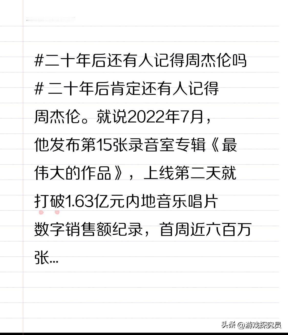 二十年后肯定还有人记得周杰伦。就说2022年7月,他发布第15张录音室专辑《最伟大的作品》,上线第二天就打破1.63亿元内地音乐唱片数字销售额纪录,首周近六百万张数字专辑在内地平台售出,远超阿黛尔专辑《25》在美国的单周销量纪录。这足以证明他庞大的粉丝基础和超高的影响力。