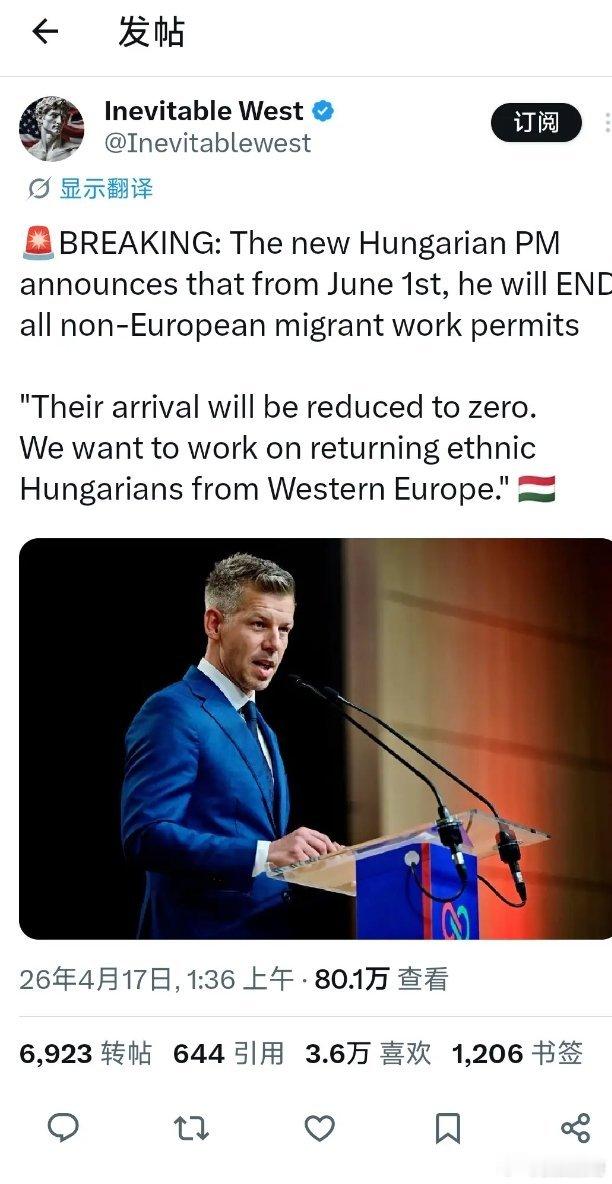 匈牙利新任总理宣布,从 6 月 1 日起,他将终止所有非欧洲籍移民的工作许可。“他们的入境人数将降至零。我们打算着手将来自西欧的匈牙利族人接回国内。” 🇭🇺 欧盟领导人空欢喜一场,没想到匈牙利人选出来一个更加保守的领导人。