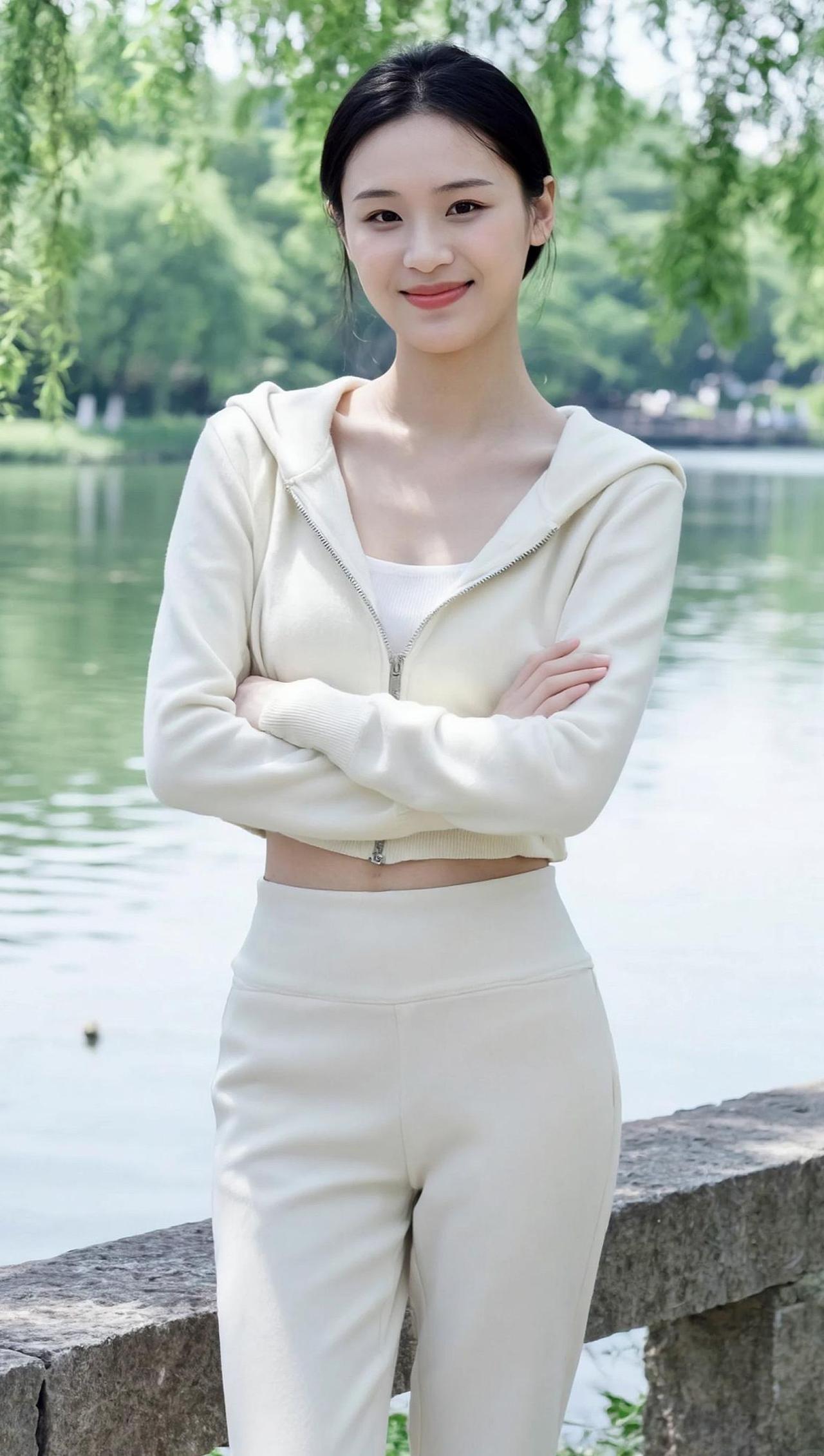 湖边的微风轻轻拂过,仿佛时间也慢了下来。她站在那里,双臂环抱,像是拥抱着整个自然。阳光透过树叶洒在她的身上,勾勒出一幅静谧而美好的画面。这样的时刻,让人忍不住想按下暂停键,把这份宁静永远留住。